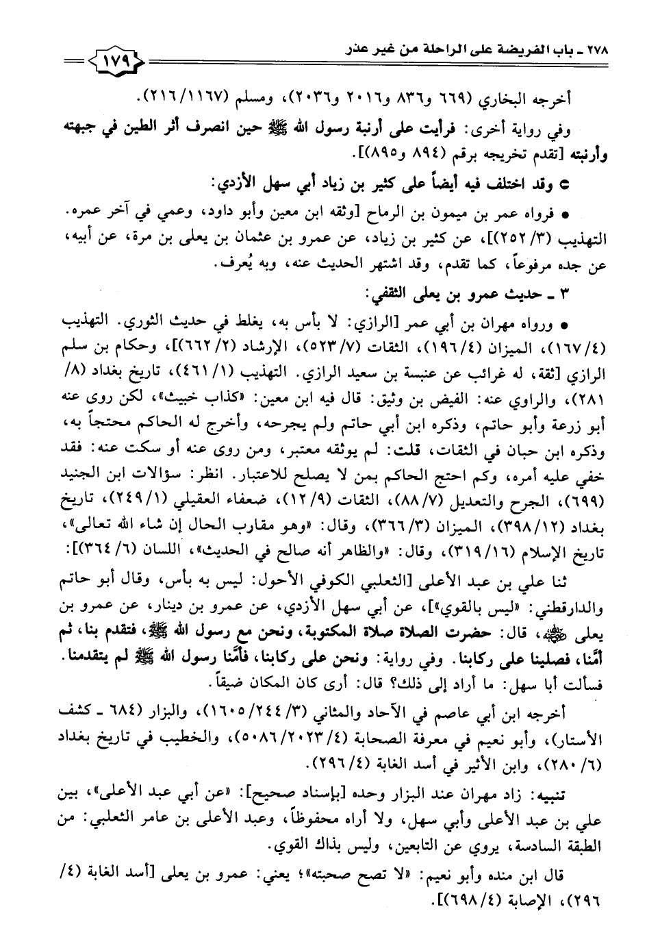 ثنا علي بن عبد الأعلى "الثعلبي الكوفي الأحول: ليس به بأس، وقال أبو حاتم والدارقطني: "ليس بالقوي"]، عن أبي سهل الأزدي، عن عمرو بن دينار، عن عمرو بن يعلى -رَضِيَ اللهُ عَنْهُ-، قال: حضرت الصلاة صلاة المكتوبة، ونحن مع رسول الله -صَلَّى اللهُ عَلَيْهِ وَسَلَّمَ-، فتقدم بنا، ثم أمَّنا، فصلينا على ركابنا. وفي رواية: ونحن على ركابنا، فأمَّنا رسول الله -صَلَّى اللهُ عَلَيْهِ وَسَلَّمَ- لم يتقدمنا. فسألت أبا سهل: ما أراد إلى ذلك؟ قال: أرى كان المكان ضيقًا.