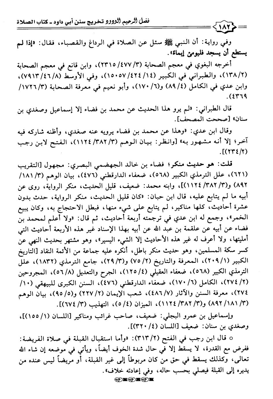 وفي رواية: أن النبي -صَلَّى اللهُ عَلَيْهِ وَسَلَّمَ- سئل عن الصلاة في الرداغ والقصباء، فقال: "إذا لم يستطع أن يسجد فليومئ إيماءً".
