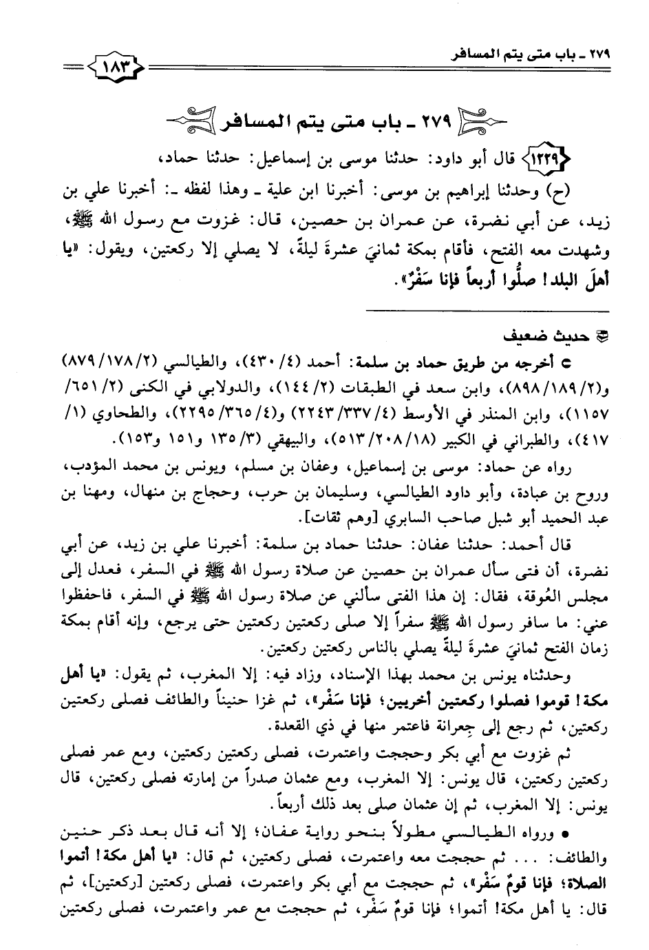 ١٢٢٩ - قال أبو داود: حدثنا موسى بن إسماعيل: حدثنا حماد، (ح) وحدثنا إبراهيم بن موسى: أخبرنا ابن علية -وهذا لفظه-: أخبرنا علي بن زيد، عن أبي نضرة، عن عمران بن حصين، قال: غزوت مع رسول الله -صَلَّى اللهُ عَلَيْهِ وَسَلَّمَ-، وشهدت معه الفتح، فأقام بمكة ثمانيَ عشرةَ ليلةً، لا يصلي إلا ركعتين، ويقول: "يا أهلَ البلد! صلُّوا أربعًا فإنا سَفْرٌ".
