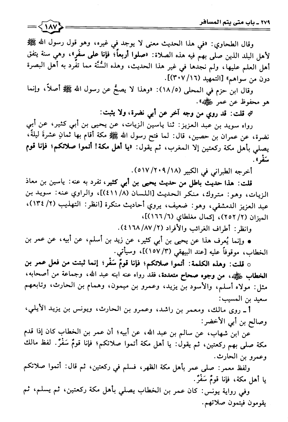 ° قلت: وهذه الكلمة: أتموا صلاتكم؛ فإنا قومٌ سَفْر؛ انما ثبتت من فعل عمر بن الخطاب -رَضِيَ اللهُ عَنْهُ-، من وجوه صحاح متعددة، فقد رواه عنه ابنه عبد الله، وجماعة من أصحابه، مثل: مولاه أسلم، والأسود بن يزيد، وعمرو بن ميمون، وهمام بن الحارث، وتابعهم سعيد بن المسيب: