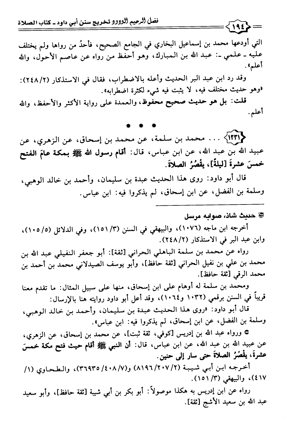 ١٢٣١ - . . . محمد بن سلمة، عن محمد بن إسحاق، عن الزهري، عن عبيد الله بن عبد الله، عن ابن عباس، قال: أقام رسول الله -صَلَّى اللهُ عَلَيْهِ وَسَلَّمَ- بمكة عامَ الفنح خمسَ عشرةَ [ليلةً]، يقْصُرُ الصلاةَ.