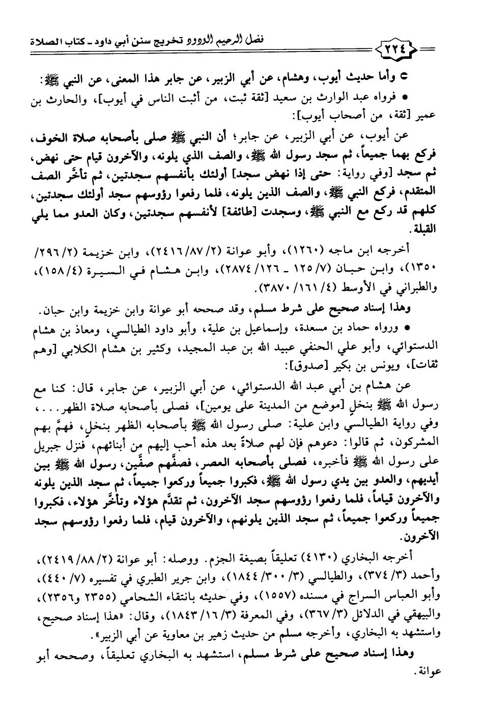 عن أيوب، عن أبي الزبير، عن جابر؛ أن النبي -صَلَّى اللهُ عَلَيْهِ وَسَلَّمَ- صلى بأصحابه صلاة الخوف، فركع بهما جميعًا، ثم سجد رسول الله -صَلَّى اللهُ عَلَيْهِ وَسَلَّمَ-، والصف الذي يلونه، والآخرون قيام حتى نهض، ثم سجد [وفي رواية: حتى إذا نهض سجد] أولئك بأنفسهم سجدتين، ثم تأخَّر الصف المتقدم، فركع النبي -صَلَّى اللهُ عَلَيْهِ وَسَلَّمَ-، والصف الذين يلونه، فلما رفعوا رؤوسهم سجد أولئك سجدتين، كلهم قد ركع مع النبي -صَلَّى اللهُ عَلَيْهِ وَسَلَّمَ-، وسجدت [طائفة] لأنفسهم سجدتين، وكان العدو مما يلي القبلة.