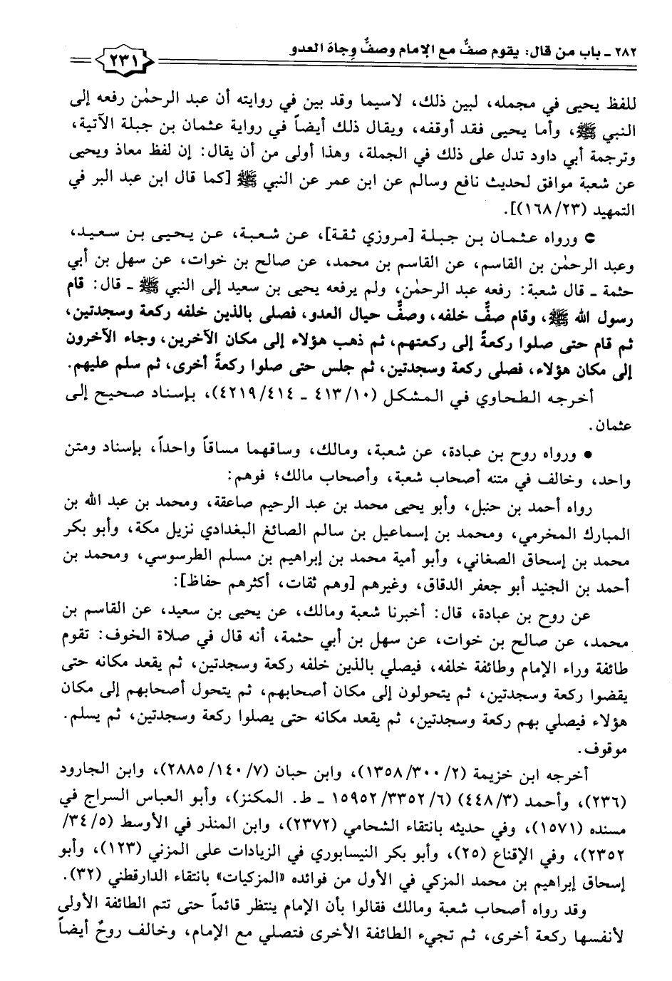 • ورواه عثمان بن جبلة [مروزي ثقة]، عن شعبة، عن يحيى بن سعيد، وعبد الرحمن بن القاسم، عن القاسم بن محمد، عن صالح بن خوات، عن سهل بن أبي حثمة -قال شعبة: رفعه عبد الرحمن، ولم يرفعه يحيى بن سعيد إلى النبي -صَلَّى اللهُ عَلَيْهِ وَسَلَّمَ-- قال: قام رسول الله -صَلَّى اللهُ عَلَيْهِ وَسَلَّمَ-، وقام صفٌّ خلفه، وصفٌّ حيال العدو، فصلى بالذين خلفه ركعة وسجدتين، ثم قام حتى صلوا ركعةً إلى ركعتهم، ثم ذهب هؤلاء إلى مكان الآخرين، وجاء الآخرون إلى مكان هؤلاء، فصلى ركعة وسجدتين، ثم جلس حتى صلوا ركعةً أخرى، ثم سلم عليهم.