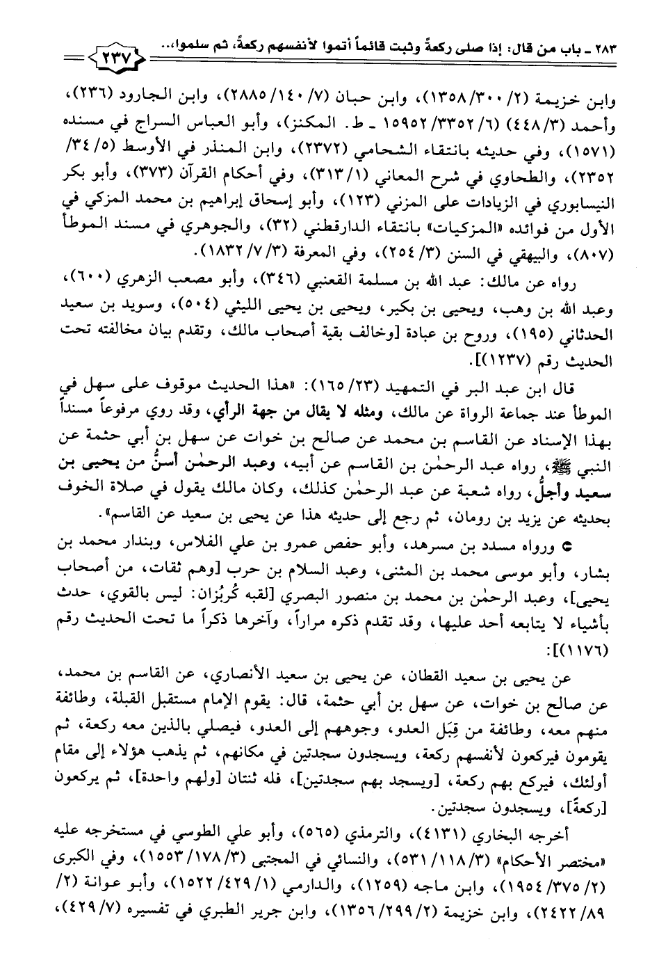 قال ابن عبد البر في التمهيد (٢٣/ ١٦٥): "هذا الحديث موقوف على سهل في الموطأ عند جماعة الرواة عن مالك، ومثله لا يقال من جهة الرأي، وقد روي مرفوعًا مسندًا بهذا الإسناد عن القاسم بن محمد عن صالح بن خوات عن سهل بن أبي حثمة عن النبي -صَلَّى اللهُ عَلَيْهِ وَسَلَّمَ-، رواه عبد الرحمن بن القاسم عن أبيه، وعبد الرحمن أسنُّ من يحيى بن سعيد وأجلُّ، رواه شعبة عن عبد الرحمن كذلك، وكان مالك يقول في صلاة الخوف بحديثه عن يزيد بن رومان، ثم رجع إلى حديثه هذا عن يحيى بن سعيد عن القاسم".