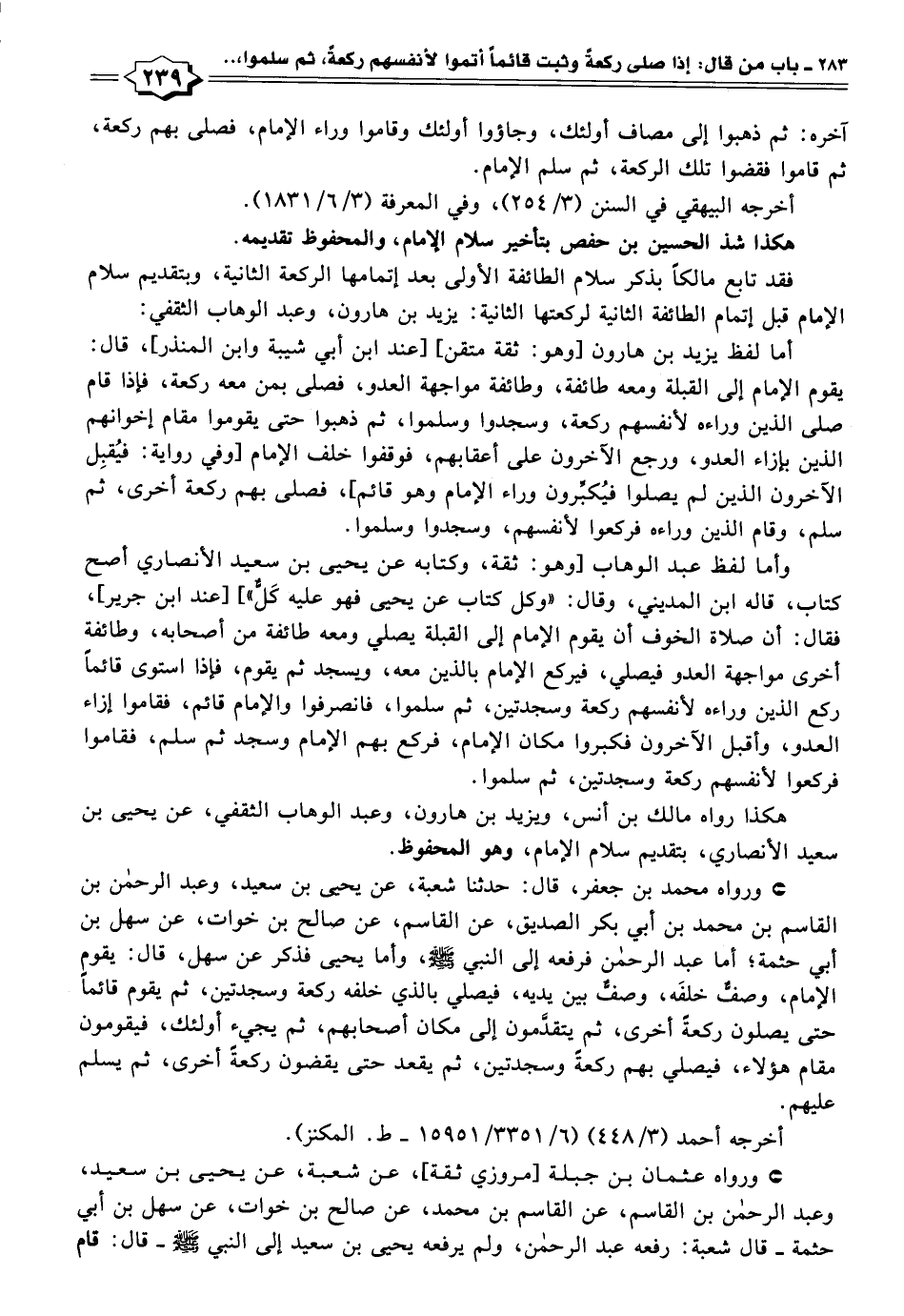 • ورواه محمد بن جعفر، قال: حدثنا شعبة، عن يحيى بن سعيد، وعبد الرحمن بن القاسم بن محمد بن أبي بكر الصديق، عن القاسم، عن صالح بن خوات، عن سهل بن أبي حثمة؛ أما عبد الرحمن فرفعه إلى النبي -صَلَّى اللهُ عَلَيْهِ وَسَلَّمَ-، وأما يحيى فذكر عن سهل، قال: يقوم الإمام، وصفٌّ خلفَه، وصفٌّ بين يديه، فيصلي بالذي خلفه ركعة وسجدتين، ثم يقوم قائمًا حتى يصلون ركعةً أخرى، ثم يتقدَّمون إلى مكان أصحابهم، ثم يجيء أولئك، فيقومون مقام هؤلاء، فيصلي بهم ركعةً وسجدتين، ثم يقعد حتى يقضون ركعةً أخرى، ثم يسلم عليهم.