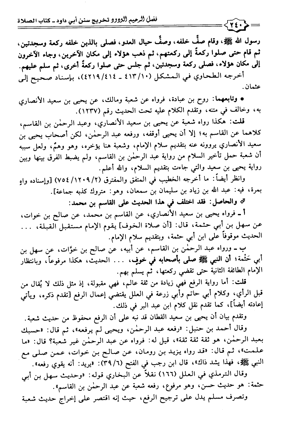 وقال أحمد بن حنبل: "رفعه عبد الرحمن، ويحيى لم يرفعه"، ثم قال: "حسبك بعبد الرحمن، هو ثقة ثقة ثقة"، قيل له: فرواه عن عبد الرحمن غير شعبة؟ قال: "ما علمت"، ثم قال: "قد رواه يزيد بن رومان، عن صالح بن خوات، عمن صلى مع النبي -صَلَّى اللهُ عَلَيْهِ وَسَلَّمَ-، فهذا يشد ذاك"، قال ابن رجب في الفتح (٦/ ٣٩): "يريد: أنه يقوي رفعه".