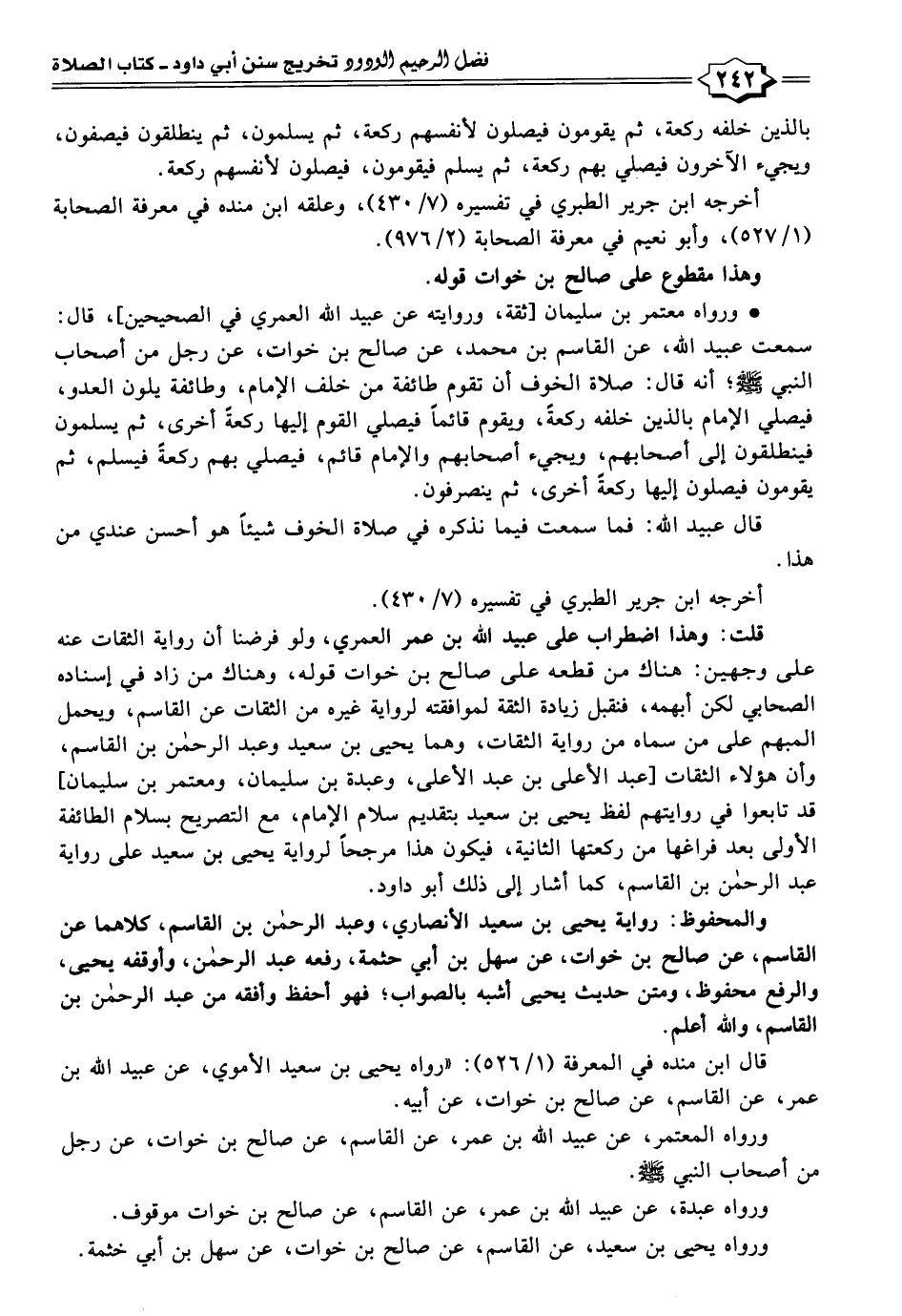 قلت: وهذا اضطراب على عبيد الله بن عمر العمري، ولو فرضنا أن رواية الثقات عنه على وجهين: هناك من قطعه على صالح بن خوات قوله، وهناك من زاد في إسناده الصحابي لكن أبهمه، فنقبل زيادة الثقة لموافقته لرواية غيره من الثقات عن القاسم، ويحمل المبهم على من سماه من رواية الثقات، وهما يحيى بن سعيد وعبد الرحمن بن القاسم، وأن هؤلاء الثقات [عبد الأعلى بن عبد الأعلى، وعبدة بن سليمان، ومعتمر بن سليمان] قد تابعوا في روايتهم لفظ يحيى بن سعيد بتقديم سلام الإمام، مع التصريح بسلام الطائفة الأولى بعد فراغها من ركعتها الثانية، فيكون هذا مرجحًا لرواية يحيى بن سعيد على رواية عبد الرحمن بن القاسم، كما أشار إلى ذلك أبو داود.