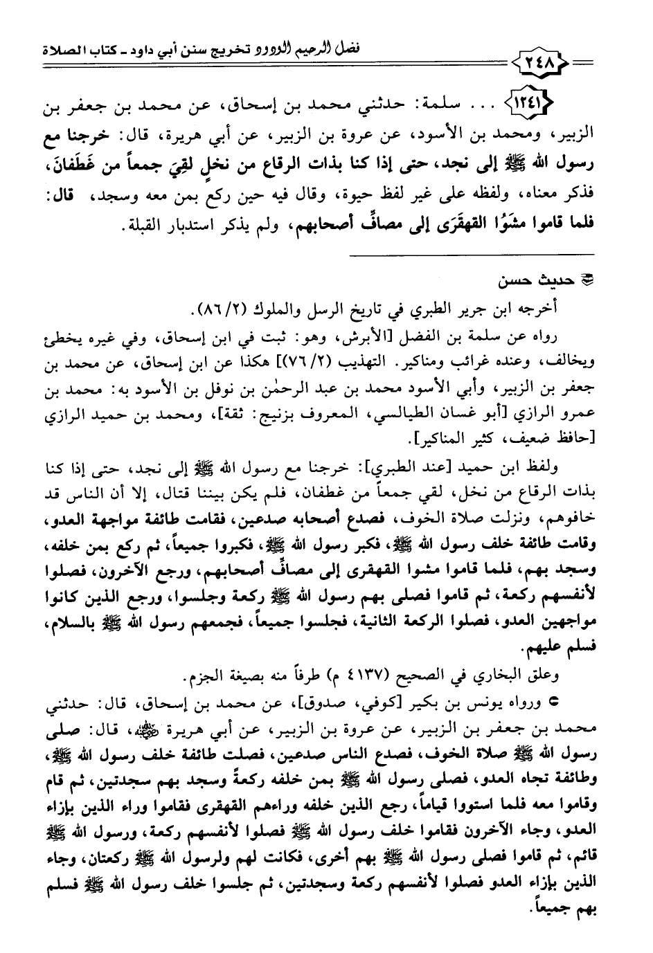 ١٢٤١ - . . . سلمة: حدثني محمد بن إسحاق، عن محمد بن جعفر بن الزبير، ومحمد بن الأسود، عن عروة بن الزبير، عن أبي هريرة، قال: خرجنا مع رسول الله -صَلَّى اللهُ عَلَيْهِ وَسَلَّمَ- إلى نجد، حتى إذا كنا بذات الرقاع من نخلٍ لقِيَ جمعًا من غَطَفانَ، فذكر معناه، ولفظه على غير لفظ حيوة، وقال فيه حين ركع بمن معه وسجد، قال: فلما قاموا مشَوُا القهقَرَى إلى مصافِّ أصحابهم، ولم يذكر استدبار القبلة.