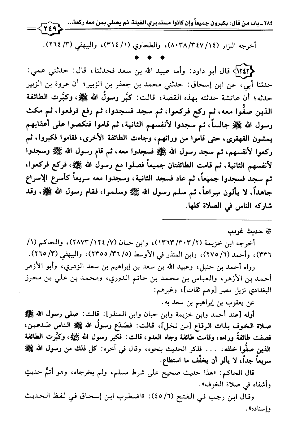١٢٤٢ - قال أبو داود: وأما عبيد الله بن سعد فحدثنا، قال: حدثني عمي: حدثنا أبي، عن ابن إسحاق: حدثني محمد بن جعفر بن الزبير؛ أن عروة بن الزبير حدثه؛ أن عائشة حدثته بهذه القصة، قالت: كبَّر رسولُ الله -صَلَّى اللهُ عَلَيْهِ وَسَلَّمَ-، وكبَّرت الطائفة الذين صفُّوا معه، ثم ركع فركعوا، ثم سجد فسجدوا، ثم رفع فرفعوا، ثم مكث رسول الله -صَلَّى اللهُ عَلَيْهِ وَسَلَّمَ- جالسًا، ثم سجدوا لأنفسهم الثانية، ثم قاموا فنكصوا على أعقابهم يمشون القهقرى، حتى قاموا من ورائهم، وجاءت الطائفة الأخرى، فقاموا فكبروا، ثم ركعوا لأنفسهم، ثم سجد رسول الله -صَلَّى اللهُ عَلَيْهِ وَسَلَّمَ- فسجدوا معه، ثم قام رسول الله -صَلَّى اللهُ عَلَيْهِ وَسَلَّمَ- وسجدوا لأنفسهم الثانية، ثم قامت الطائفتان جميعًا فصلوا مع رسول الله -صَلَّى اللهُ عَلَيْهِ وَسَلَّمَ-، فركع فركعوا، ثم سجد فسجدوا جميعًا، ثم عاد فسجد الثانية، وسجدوا معه سريعًا كأسرع الإسراع جاهدًا، لا يألون سِراعًا، ثم سلم رسول الله -صَلَّى اللهُ عَلَيْهِ وَسَلَّمَ- وسلموا، فقام رسول الله -صَلَّى اللهُ عَلَيْهِ وَسَلَّمَ-، وقد شاركه الناس في الصلاة كلها.