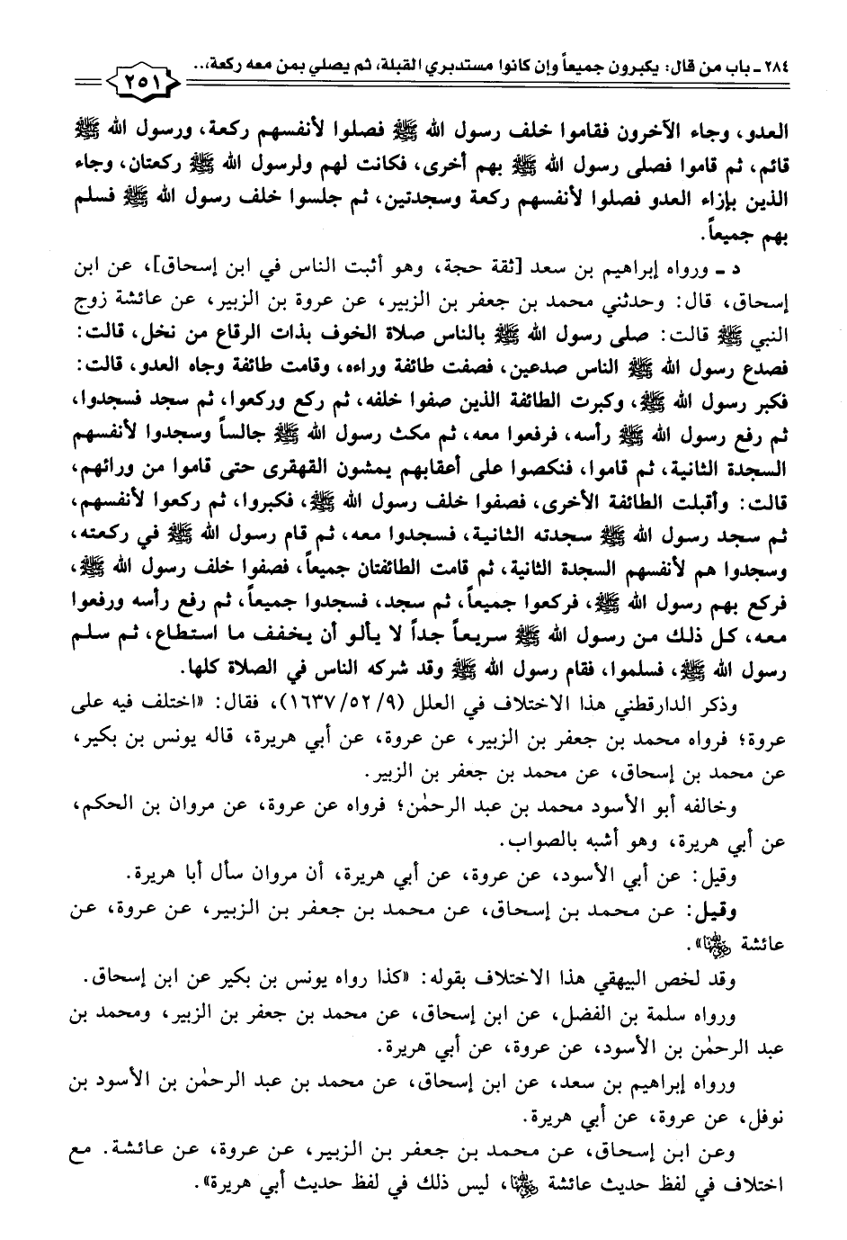 د - ورواه إبراهيم بن سعد [ثقة حجة، وهو أثبت الناس في ابن إسحاق]، عن ابن إسحاق، قال: وحدثني محمد بن جعفر بن الزبير، عن عروة بن الزبير، عن عائشة زوج النبي -صَلَّى اللهُ عَلَيْهِ وَسَلَّمَ- قالت: صلى رسول الله -صَلَّى اللهُ عَلَيْهِ وَسَلَّمَ- بالناس صلاة الخوف بذات الرقاع من نخل، قالت: فصدع رسول الله -صَلَّى اللهُ عَلَيْهِ وَسَلَّمَ- الناس صدعين، فصفت طائفة وراءه، وقامت طائفة وجاه العدو، قالت: فكبر رسول الله -صَلَّى اللهُ عَلَيْهِ وَسَلَّمَ-، وكبرت الطائفة الذين صفوا خلفه، ثم ركع وركعوا، ثم سجد فسجدوا، ثم رفع رسول الله -صَلَّى اللهُ عَلَيْهِ وَسَلَّمَ- رأسه، فرفعوا معه، ثم مكث رسول الله -صَلَّى اللهُ عَلَيْهِ وَسَلَّمَ- جالسًا وسجدوا لأنفسهم السجدة الثانية، ثم قاموا، فنكصوا على أعقابهم يمشون القهقرى حتى قاموا من ورائهم، قالت: وأقبلت الطائفة الأخرى، فصفوا خلف رسول الله -صَلَّى اللهُ عَلَيْهِ وَسَلَّمَ-، فكبروا، ثم ركعوا لأنفسهم، ثم سجد رسول الله -صَلَّى اللهُ عَلَيْهِ وَسَلَّمَ- سجدته الثانية، فسجدوا معه، ثم قام رسول الله -صَلَّى اللهُ عَلَيْهِ وَسَلَّمَ- في ركعته، وسجدوا هم لأنفسهم السجدة الثانية، ثم قامت الطائفتان جميعًا، فصفوا خلف رسول الله -صَلَّى اللهُ عَلَيْهِ وَسَلَّمَ-، فركع بهم رسول الله -صَلَّى اللهُ عَلَيْهِ وَسَلَّمَ-، فركعوا جميعًا، ثم سجد، فسجدوا جميعًا، ثم رفع رأسه ورفعوا معه، كل ذلك من رسول الله -صَلَّى اللهُ عَلَيْهِ وَسَلَّمَ- سريعًا جدًّا لا يألو أن يخفف ما استطاع، ثم سلم رسول الله -صَلَّى اللهُ عَلَيْهِ وَسَلَّمَ-، فسلموا، فقام رسول الله -صَلَّى اللهُ عَلَيْهِ وَسَلَّمَ- وقد شركه الناس في الصلاة كلها.