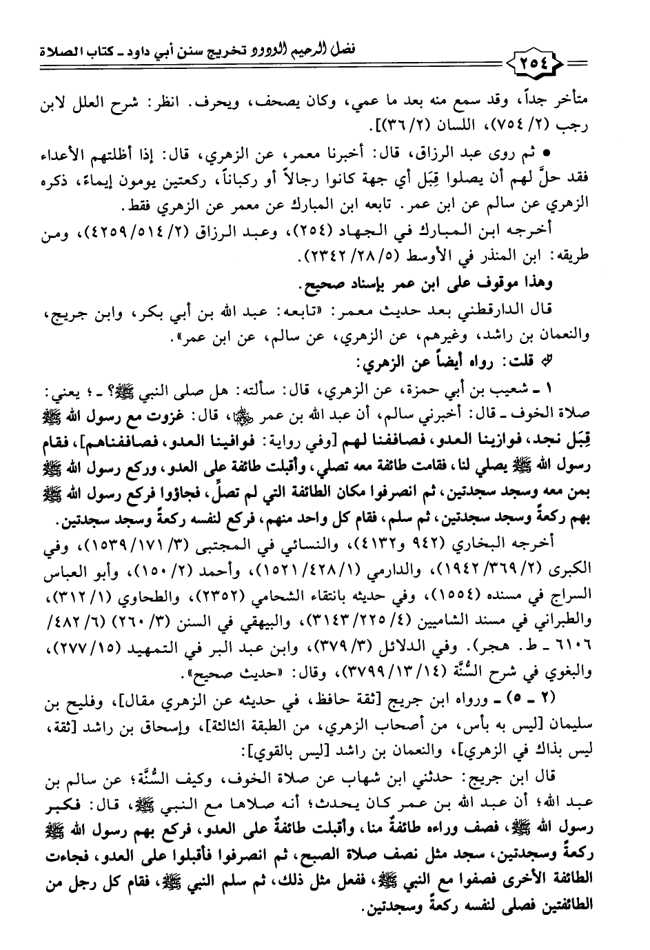 قال ابن جريج: حدثني ابن شهاب عن صلاة الخوف، وكيف السُّنَّة؛ عن سالم بن عبد الله؛ أن عبد الله بن عمر كان يحدث؛ أنه صلاها مع النبي -صَلَّى اللهُ عَلَيْهِ وَسَلَّمَ-، قال: فكبر رسول الله -صَلَّى اللهُ عَلَيْهِ وَسَلَّمَ-، فصف وراءه طائفةٌ منا، وأقبلت طائفةٌ على العدو، فركع بهم رسول الله -صَلَّى اللهُ عَلَيْهِ وَسَلَّمَ- ركعةً وسجدتين، سجد مثل نصف صلاة الصبح، ثم انصرفوا فأقبلوا على العدو، فجاءت الطائفة الأخرى فصفوا مع النبي -صَلَّى اللهُ عَلَيْهِ وَسَلَّمَ-، ففعل مثل ذلك، ثم سلم النبي -صَلَّى اللهُ عَلَيْهِ وَسَلَّمَ-، فقام كل رجل من الطائفتين فصلى لنفسه ركعةً وسجدتين.