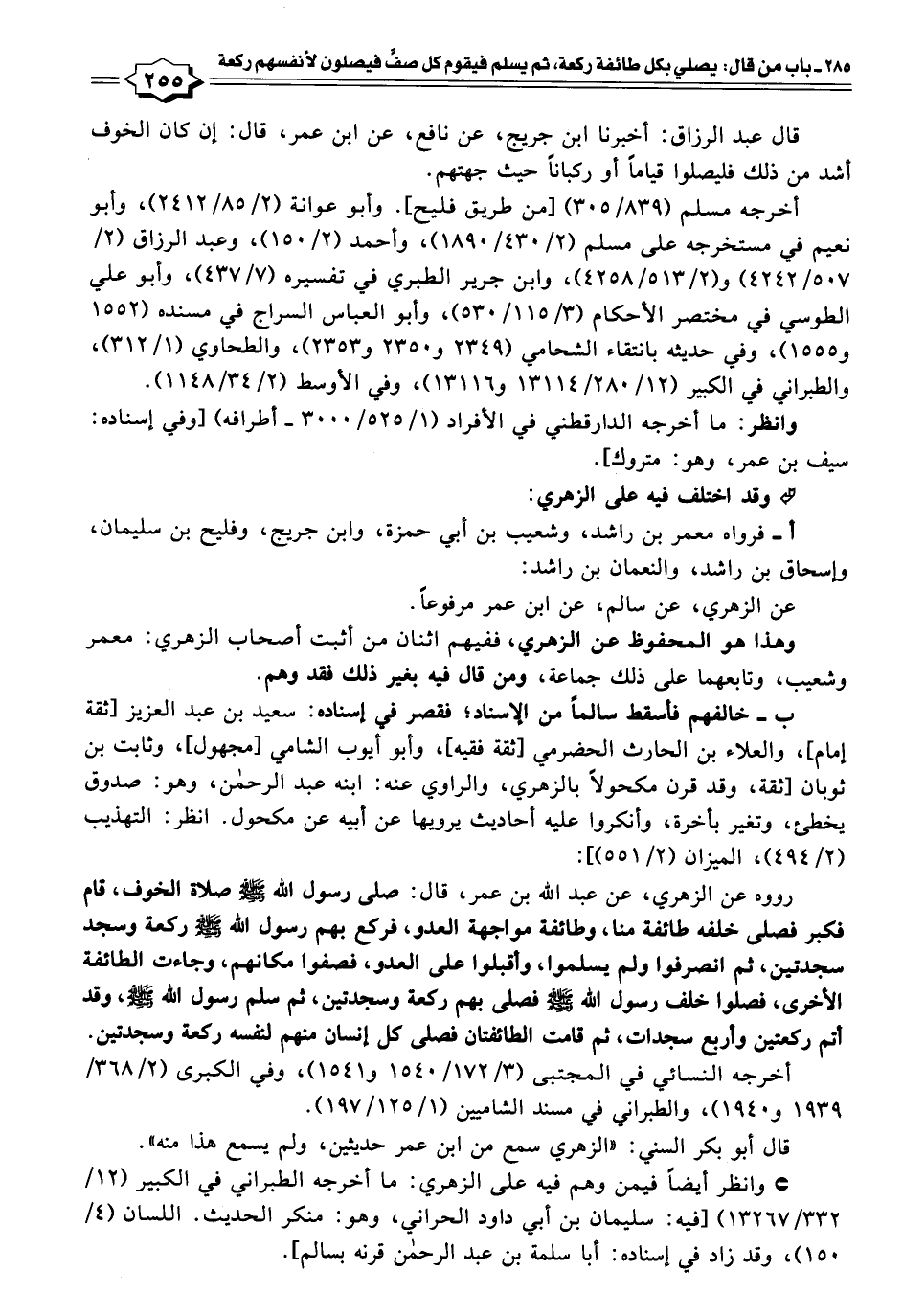 رووه عن الزهري، عن عبد الله بن عمر، قال: صلى رسول الله -صَلَّى اللهُ عَلَيْهِ وَسَلَّمَ- صلاة الخوف، قام فكبر فصلى خلفه طائفة منا، وطائفة مواجهة العدو، فركع بهم رسول الله -صَلَّى اللهُ عَلَيْهِ وَسَلَّمَ- ركعة وسجد سجدتين، ثم انصرفوا ولم يسلموا، وأقبلوا على العدو، فصفوا مكانهم، وجاءت الطائفة الأخرى، فصلوا خلف رسول الله -صَلَّى اللهُ عَلَيْهِ وَسَلَّمَ- فصلى بهم ركعة وسجدتين، ثم سلم رسول الله -صَلَّى اللهُ عَلَيْهِ وَسَلَّمَ-، وقد أتم ركعتين وأربع سجدات، ثم قامت الطائفتان فصلى كل إنسان منهم لنفسه ركعة وسجدتين.