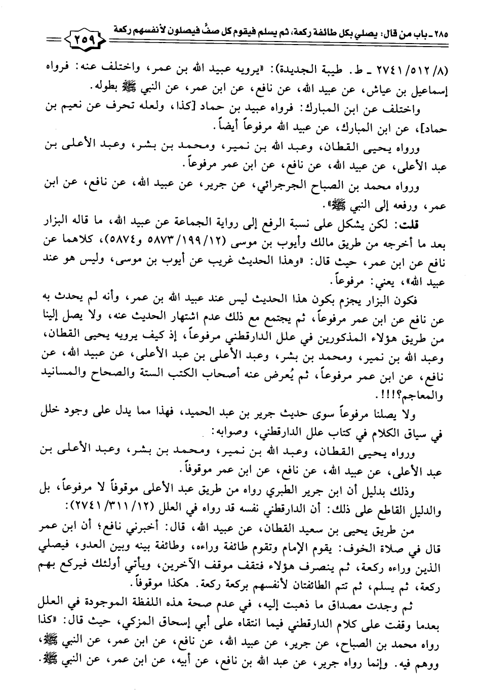 فكون البزار يجزم بكون هذا الحديث ليس عند عبيد الله بن عمر، وأنه لم يحدث به عن نافع عن ابن عمر مرفوعًا، ثم يجتمع مع ذلك عدم اشتهار الحديث عنه، ولا يصل إلينا من طريق هؤلاء المذكورين في علل الدارقطني مرفوعًا، إذ كيف يرويه يحيى القطان، وعبد الله بن نمير، ومحمد بن بشر، وعبد الأعلى بن عبد الأعلى، عن عبيد الله، عن نافع، عن ابن عمر مرفوعًا، ثم يُعرض عنه أصحاب الكتب الستة والصحاح والمسانيد والمعاجم؟!!!.