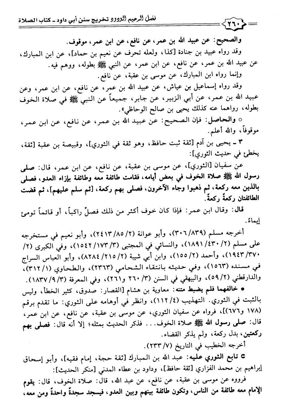 عن سفيان [الثوري]، عن موسى بن عقبة، عن نافع، عن ابن عمر، قال: صلى رسول الله - صلى الله عليه وسلم - صلاة الخوف في بعض أيامه، فقامت طائفة معه وطائفة بإزاء العدو، فصلى بالذين معه ركعة، ثم ذهبوا وجاء الآخرون، فصلى بهم ركعة، [ثم سلم عليهم]، ثم قضت الطائفتان ركعةً ركعةً.