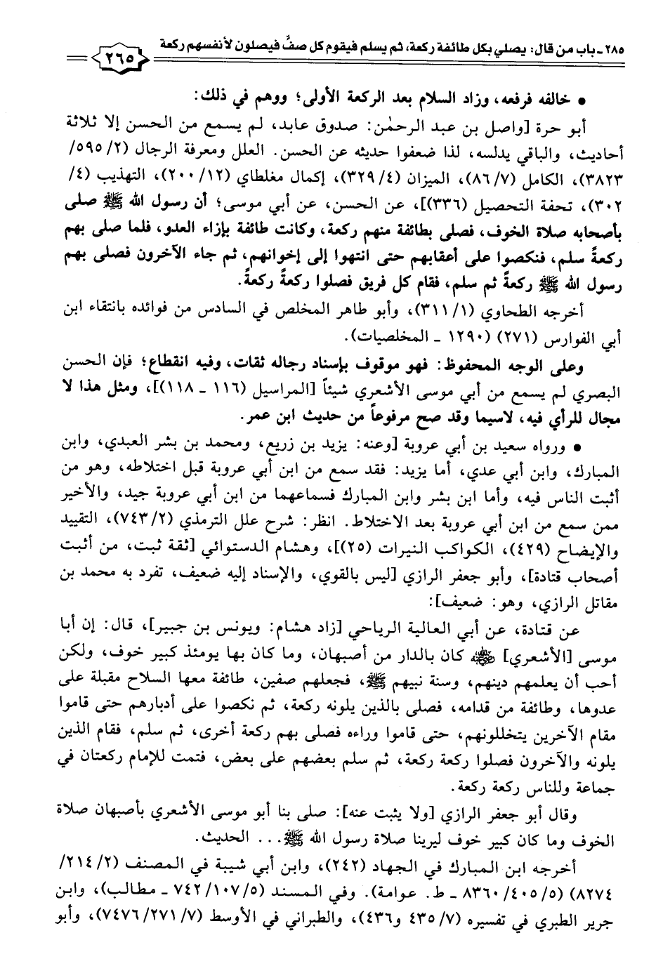 أبو حرة [واصل بن عبد الرحمن: صدوق عابد، لم يسمع من الحسن إلا ثلاثة أحاديث، والباقي يدلسه، لذا ضعفوا حديثه عن الحسن. العلل ومعرفة الرجال (٢/ ٥٩٥/ ٣٨٢٣)، الكامل (٧/ ٨٦)، الميزان (٤/ ٣٢٩)، إكمال مغلطاي (١٢/ ٢٠٠)، التهذيب (٤/ ٣٠٢)، تحفة التحصيل (٣٣٦)]، عن الحسن، عن أبي موسى؛ أن رسول الله - صلى الله عليه وسلم - صلى بأصحابه صلاة الخوف، فصلى بطائفة منهم ركعة، وكانت طائفة بإزاء العدو، فلما صلى بهم ركعةً سلم، فنكصوا على أعقابهم حتى انتهوا إلى إخوانهم، ثم جاء الآخرون فصلى بهم رسول الله - صلى الله عليه وسلم - ركعةً ثم سلم، فقام كل فريق فصلوا ركعةً ركعةً.