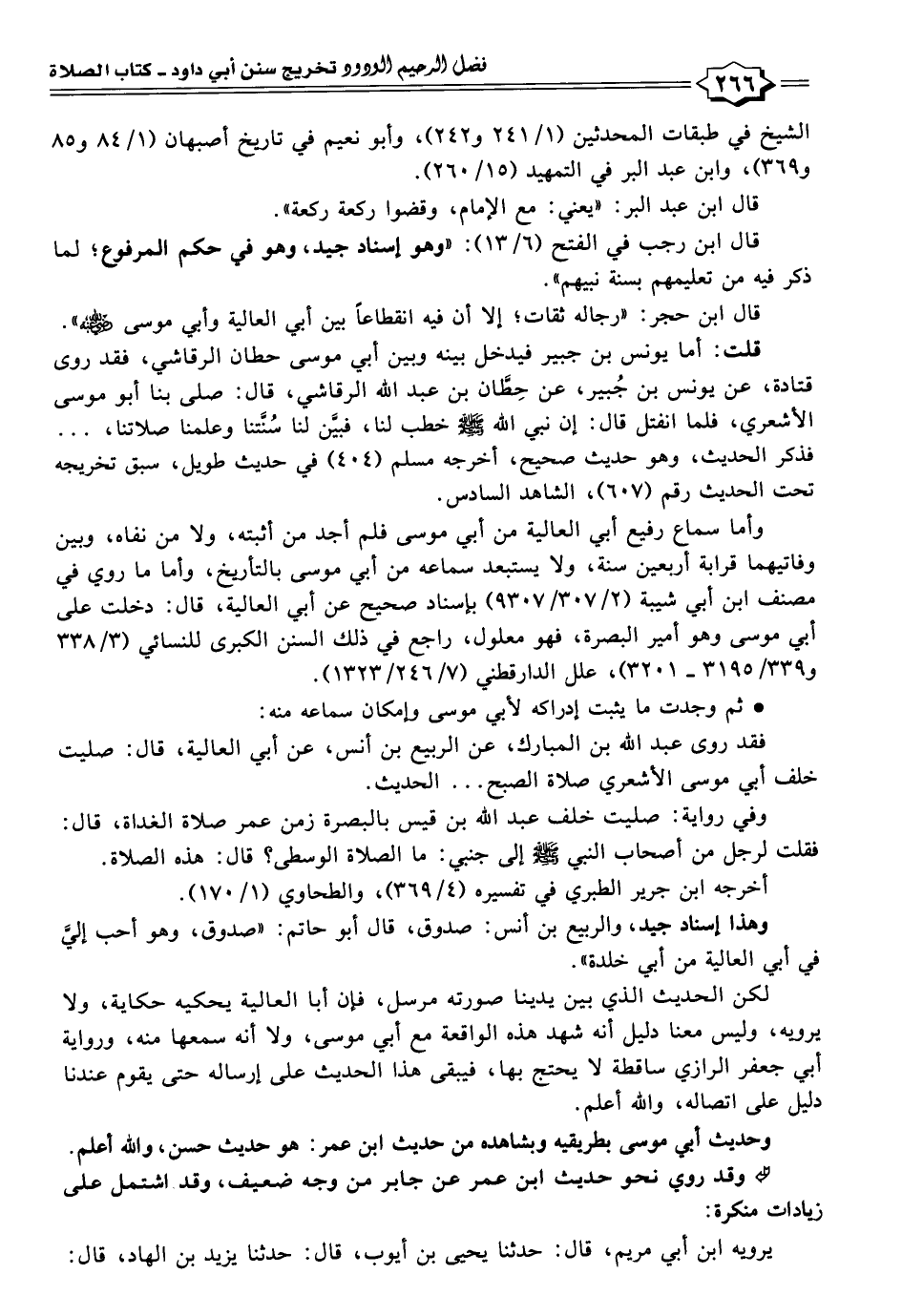 لكن الحديث الذي بين يدينا صورته مرسل، فإن أبا العالية يحكيه حكاية، ولا يرويه، وليس معنا دليل أنه شهد هذه الواقعة مع أبي موسى، ولا أنه سمعها منه، ورواية أبي جعفر الرازي ساقطة لا يحتج بها، فيبقى هذا الحديث على إرساله حتى يقوم عندنا دليل على اتصاله، والله أعلم.