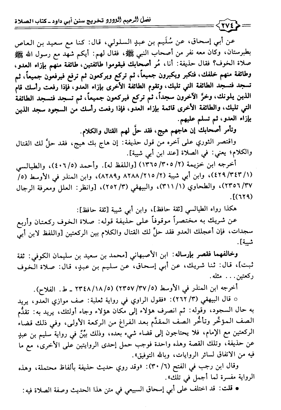 عن أبي إسحاق، عن سُلَيم بن عبدٍ السلولي، قال: كنا مع سعيد بن العاص بطبرستان، وكان معه نفر من أصحاب النبي - صلى الله عليه وسلم -: فقال لهم: أيكم شهد مع رسول الله - صلى الله عليه وسلم - صلاة الخوف؟ فقال حذيفة: أنا، مُر أصحابك فيقوموا طائفتين، طائفة منهم بإزاء العدو، وطائفة منهم خلفك، فتكبر ويكبرون جميعًا، ثم تركع ويركعون ثم ترفع فيرفعون جميعًا، ثم تسجد فتسجد الطائفة التي تليك، وتقوم الطائفة الأخرى بإزاء العدو، فإذا رفعت رأسك قام الدين يلونك، وخرَّ الآخرون سجدًا، ثم تركع فيركعون جميعًا، ثم تسجد فتسجد الطائفة التي تليك، والطائفة الأخرى قائمة بإزاء العدو، فإذا رفعت رأسك من السجود سجد الذين بإزاء العدو، ثم تسلم عليهم.