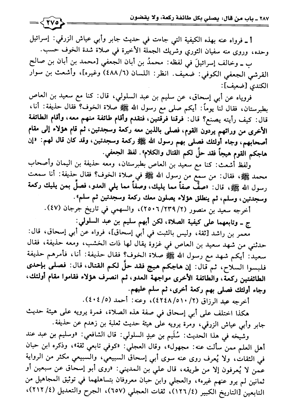 هكذا اختلف على أبي إسحاق في صفة هذه الصلاة، فمرة يرويه على هيئة حديث جابر وأبي عياش الزرقي، ومرة يرويه على هيئة حديث ثعلبة بن زهدم عن حذيفة.