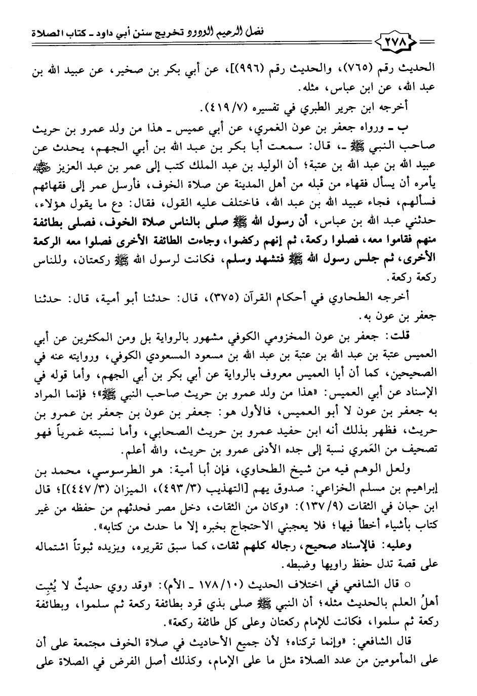 ب - ورواه جعفر بن عون الغمري، عن أبي عميس - هذا من ولد عمرو بن حريث صاحب النبي - صلى الله عليه وسلم - -، قال: سمعت أبا بكر بن عبد الله بن أبي الجهم، يحدث عن عبيد الله بن عبد الله بن عتبة؛ أن الوليد بن عبد الملك كتب إلى عمر بن عبد العزيز - رضي الله عنه - يأمره أن يسأل فقهاء من قبله من أهل المدينة عن صلاة الخوف، فأرسل عمر إلى فقهائهم فسألهم، فجاء عبيد الله بن عبد الله، فاختلف عليه القول، فقال: دع ما يقول هؤلاء، حدثني عبد الله بن عباس، أن رسول الله - صلى الله عليه وسلم - صلى بالناس صلاة الخوف، فصلى بطائفة منهم فقاموا معه، فصلوا ركعة، ثم إنهم ركضوا، وجاءت الطائفة الأخرى فصلوا معه الركعة الأخرى، ثم جلس رسول الله - صلى الله عليه وسلم - فتشهد وسلم، فكانت لرسول الله - صلى الله عليه وسلم - ركعتان، وللناس ركعة ركعة.