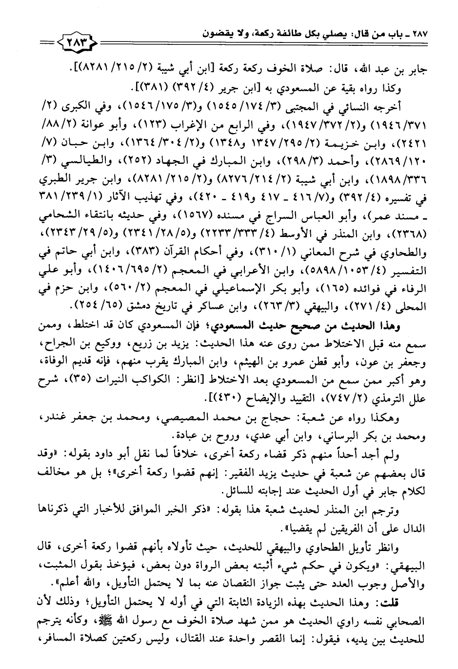 قلت: وهذا الحديث بهذه الزيادة الثابتة التي في أوله لا يحتمل التأويل؛ وذلك لأن الصحابي نفسه راوي الحديث هو ممن شهد صلاة الخوف مع رسول الله - صلى الله عليه وسلم -، وكأنه يترجم للحديث بين يديه، فيقول: إنما القصر واحدة عند القتال، وليس ركعتين كصلاة المسافر،