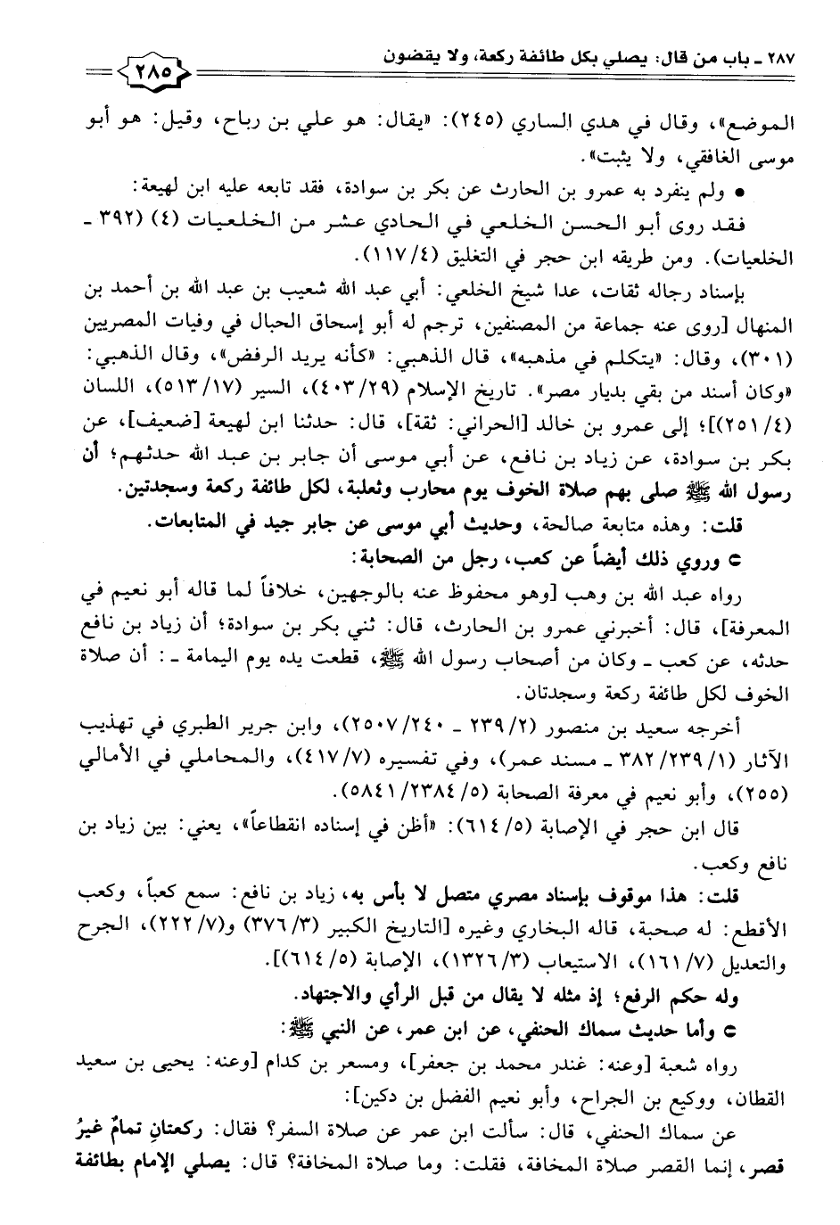 بإسناد رجاله ثقات، عدا شيخ الخلعي: أبي عبد الله شعيب بن عبد الله بن أحمد بن المنهال [روى عنه جماعة من المصنفين، ترجم له أبو إسحاق الحبال في وفيات المصريين (٣٠١)، وقال: "يتكلم في مذهبه"، قال الذهبي: "كأنه يريد الرفض"، وقال الذهبي: "وكان أسند من بقي بديار مصر". تاريخ الإسلام (٢٩/ ٤٠٣)، السير (١٧/ ٥١٣)، اللسان (٤/ ٢٥١)]؛ إلى عمرو بن خالد [الحراني: ثقة]، قال: حدثنا ابن لهيعة [ضعيف]، عن بكر بن سوادة، عن زياد بن نافع، عن أبي موسى أن جابر بن عبد الله حدثهم؛ أن رسول الله - صلى الله عليه وسلم - صلى بهم صلاة الخوف يوم محارب وثعلبة، لكل طائفة ركعة وسجدتين.