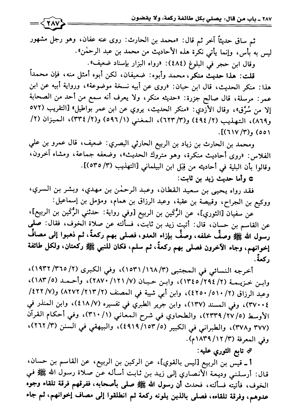 عن سفيان [الثوري]، عن الرُّكَين بن الربيع [وفي رواية: حدثني الرُّكَين بن الربيع]، عن القاسم بن حسان، قال: أتيت زيد بن ثابت، فسألته عن صلاة الخوف، فقال: صلى رسول الله - صلى الله عليه وسلم - وصفٌّ خلفه، وصفٌّ بإزاء العدو، فصلى بهم ركعةً، ثم ذهبوا إلى مصافِّ إخوانهم، وجاء الآخرون فصلى بهم ركعةً، ثم سلم، فكان للنبي - صلى الله عليه وسلم - ركعتان، ولكل طانفة ركعةٌ.