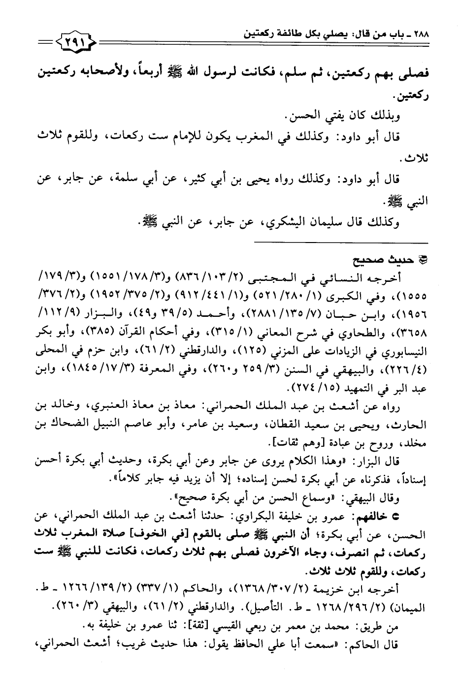 * خالفهم: عمرو بن خليفة البكراوي: حدثنا أشعث بن عبد الملك الحمراني، عن الحسن، عن أبي بكرة؛ أن النبي - صلى الله عليه وسلم - صلى بالقوم [في الخوف] صلاة المغرب ثلاث ركعات، ثم انصرف، وجاء الآخرون فصلى بهم ثلاث ركعات، فكانت للنبي - صلى الله عليه وسلم - ست ركعات، وللقوم ثلاث ثلاث.