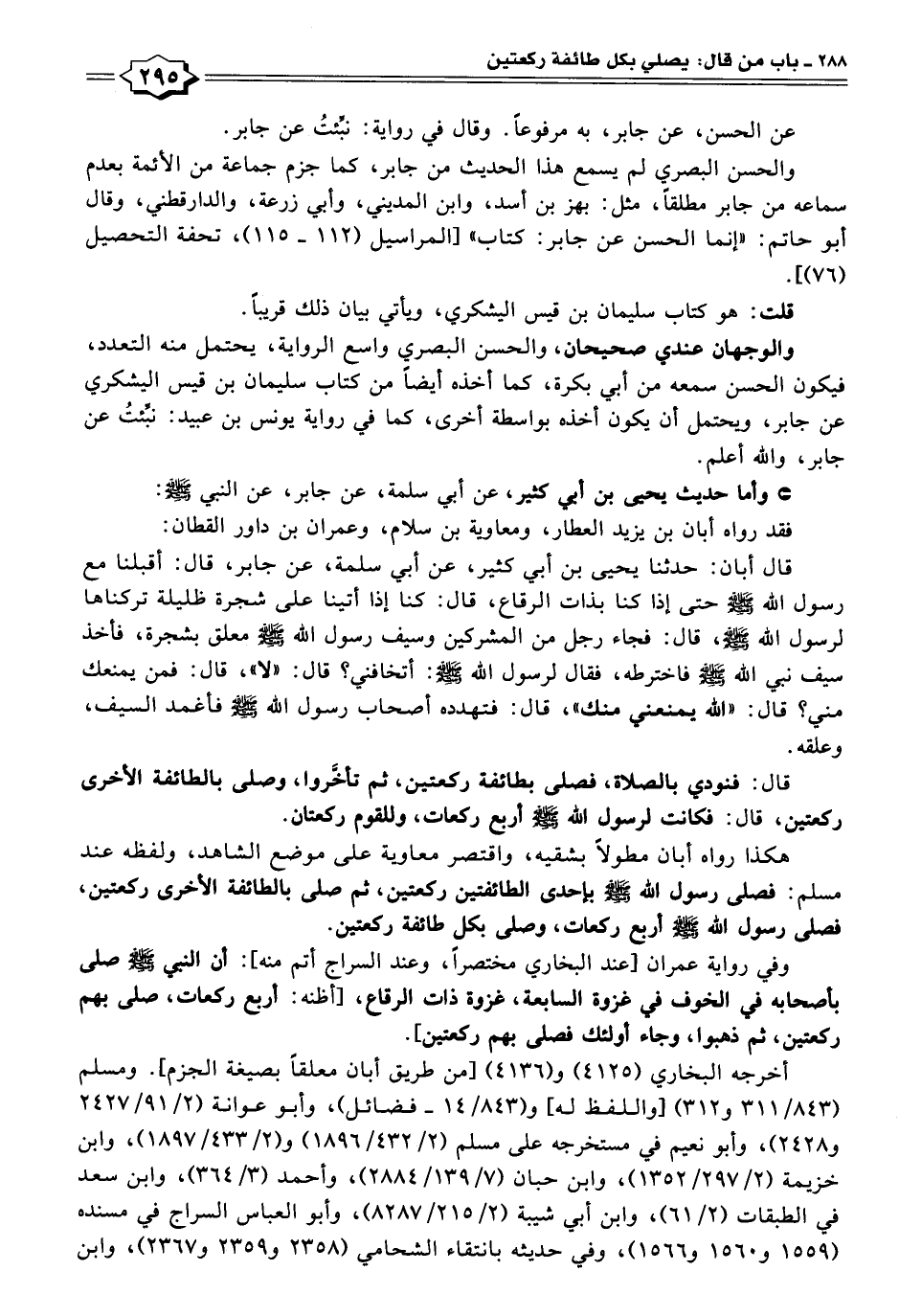 وفي رواية عمران [عند البخاري مختصرًا، وعند السراج أتم منه]: أن النبي - صلى الله عليه وسلم - صلى بأصحابه في الخوف في غزوة السابعة، غزوة ذات الرقاع، [أظنه: أربع ركعات، صلى بهم ركعتين، ثم ذهبوا، وجاء أولئك فصلى بهم ركعتين].