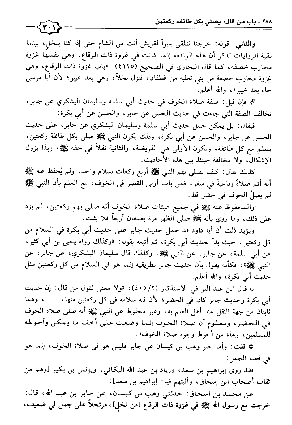 * قال ابن عبد البر في الاستذكار (٢/ ٤٠٥): "ولا معنى لقول من قال: إن حديث أبي بكرة وحديث جابر كان في الحضر؛ لأن فيه سلامه في كل ركعتين منها، ... ، وهما ثابتان من جهة النقل عند أهل العلم به، وغير محفوظ عن النبي - صلى الله عليه وسلم - أنه صلى صلاة الخوف في الحضر، ومعلوم أن صلاة الخوف إنما وضعت على أخف ما يمكن وأحوطه للمسلمين، وهذا من أحوط وجوه صلاة الخوف".