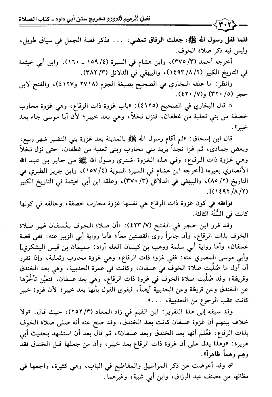 وقد قرر ابن حجر في الفتح (٧/ ٤٢٣): "أن صلاة الخوف بعُسفان غير صلاة الخوف بذات الرقاع، وأن جابرًا روى القصتين معًا؛ فأما رواية أبي الزبير عنه: ففي قصة عسفان، وأما رواية أبي سلمة ووهب بن كيسان [لعله أراد: سليمان بن قيس اليشكري] وأبي موسى المصري عنه: ففي غزوة ذات الرقاع، وهي غزوة محارب وثعلبة، وإذا تقرر أن أول ما صُلِّيت صلاة الخوف في عسفان، وكانت في عمرة الحديبية، وهي بعد الخندق وقريظة، وقد صُلِّيت صلاة الخوف في غزوة ذات الرقاع، وهي بعد عسفان، فتعيَّن تأخُّرُها عن الخندق وعن قريظة وعن الحديبية أيضًا، فيقوى القول بأنها بعد خيبر؛ لأن غزوة خيبر كانت عقب الرجوع من الحديبية، ... ".