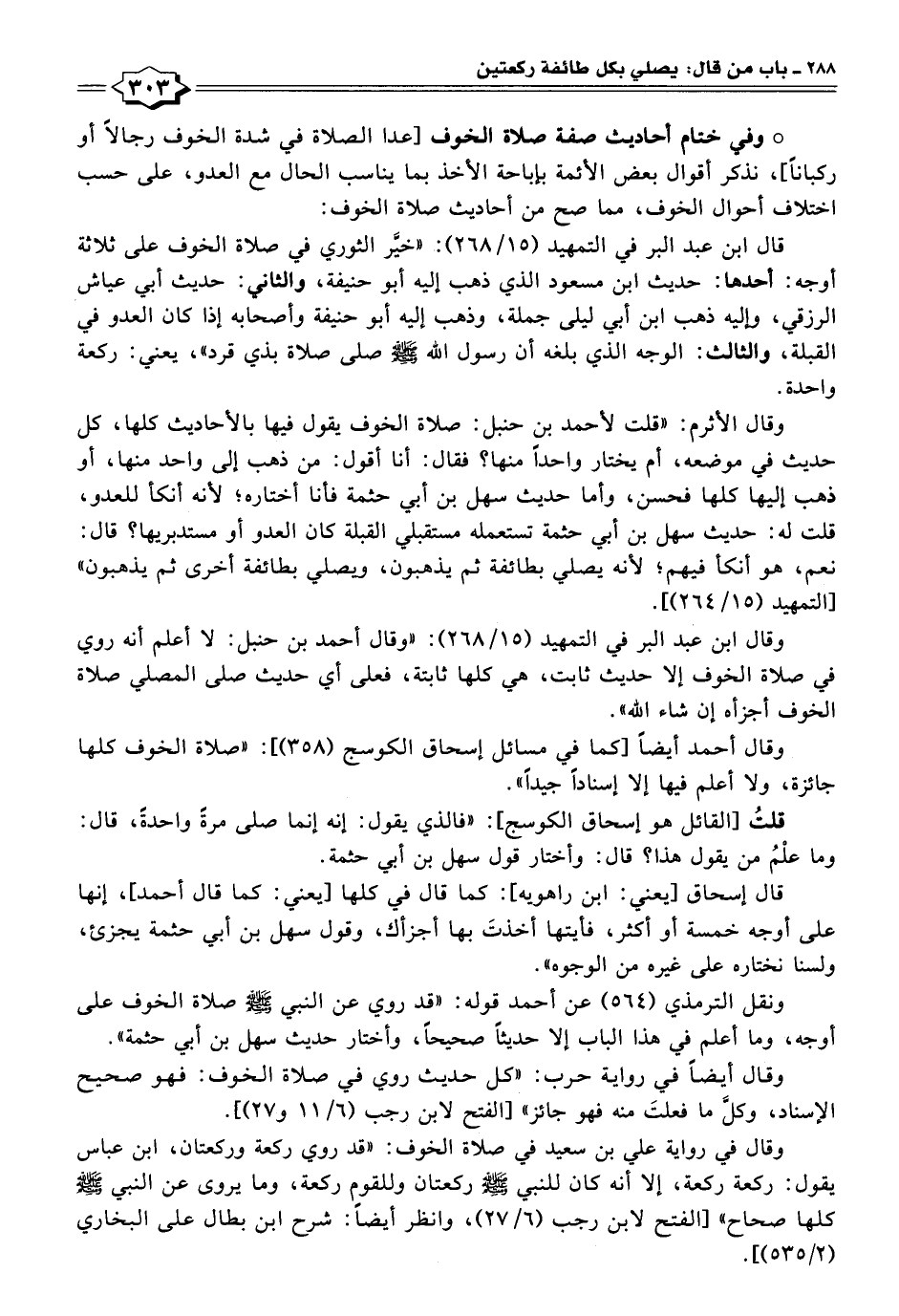 وقال ابن عبد البر في التمهيد (١٥/ ٢٦٨): "وقال أحمد بن حنبل: لا أعلم أنه روي في صلاة الخوف إلا حديث ثابت، هي كلها ثابتة، فعلى أي حديث صلى المصلي صلاة الخوف أجزأه إن شاء الله".