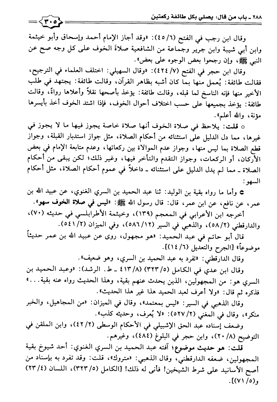 • وأما ما رواه بقية بن الوليد: ثنا عبد الحميد بن السري الغنوي، عن عبيد الله بن عمر، عن نافع، عن ابن عمر، قال: قال رسول الله - صلى الله عليه وسلم -: "ليس في صلاة الخوف سهو".