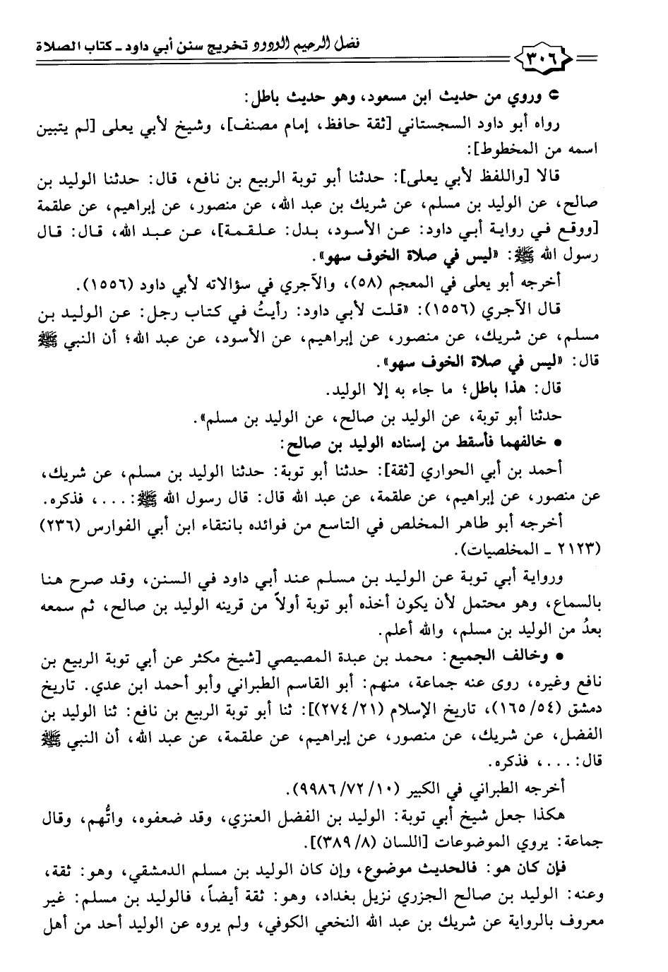 قالا [واللفظ لأبي يعلى]: حدثنا أبو توبة الربيع بن نافع، قال: حدثنا الوليد بن صالح، عن الوليد بن مسلم، عن شريك بن عبد الله، عن منصور، عن إبراهيم، عن علقمة [ووقع في رواية أبي داود: عن الأسود، بدل: علقمة]، عن عبد الله، قال: قال رسول الله - صلى الله عليه وسلم -: "ليس في صلاة الخوف سهو".
