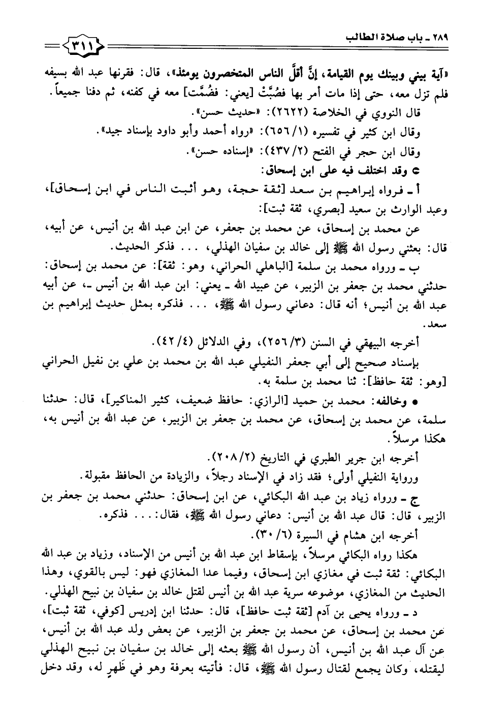 د - ورواه يحيى بن آدم [ثقة ثبت حافظ]، قال: حدثنا ابن إدريس [كوفي، ثقة ثبت]، عن محمد بن إسحاق، عن محمد بن جعفر بن الزبير، عن بعض ولد عبد الله بن أنيس، عن آل عبد الله بن أنيس، أن رسول الله - صلى الله عليه وسلم - بعثه إلى خالد بن سفيان بن نبيح الهذلي ليقتله، وكان يجمع لقتال رسول الله - صلى الله عليه وسلم -، قال: فأتيته بعرفة وهو في ظَهرٍ له، وقد دخل