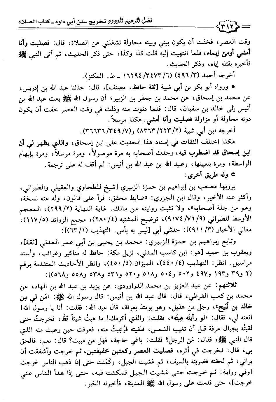 • ورواه أبو بكر بن أبي شيبة [ثقة حافظ، مصنف]، قال: حدثنا عبد الله بن إدريس، عن محمد بن إسحاق، عن محمد بن جعفر بن الزبير؛ أن رسول الله - صلى الله عليه وسلم - بعث عبد الله بن أنيس إلى خالد بن سفيان، قال: فلما دنوت منه وذلك في وقت العصر خفت أن يكون دونه محاولة أو مزاولة فصليت وأنا أمشي. هكذا مرسلًا.