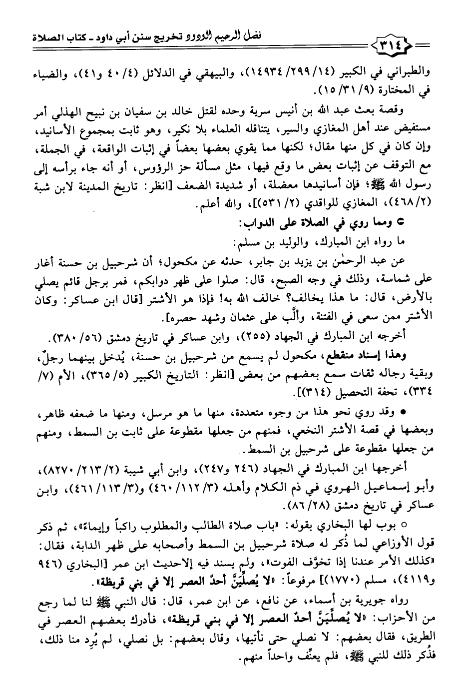 ° بوب لها البخاري بقوله: "باب صلاة الطالب والمطلوب راكبًا وإيماءً، ثم ذكر قول الأوزاعي لما ذُكر له صلاة شرحبيل بن السمط وأصحابه على ظهر الدابة، فقال: "كذلك الأمر عندنا إذا تخوَّف الفوت، ولم يسند فيه إلا حديث ابن عمر [البخاري (٩٤٦ و ٤١١٩)، مسلم (١٧٧٠)] مرفوعًا: "لا يُصلِّيَنَّ أحدٌ العصر إلا في بني قريظة".