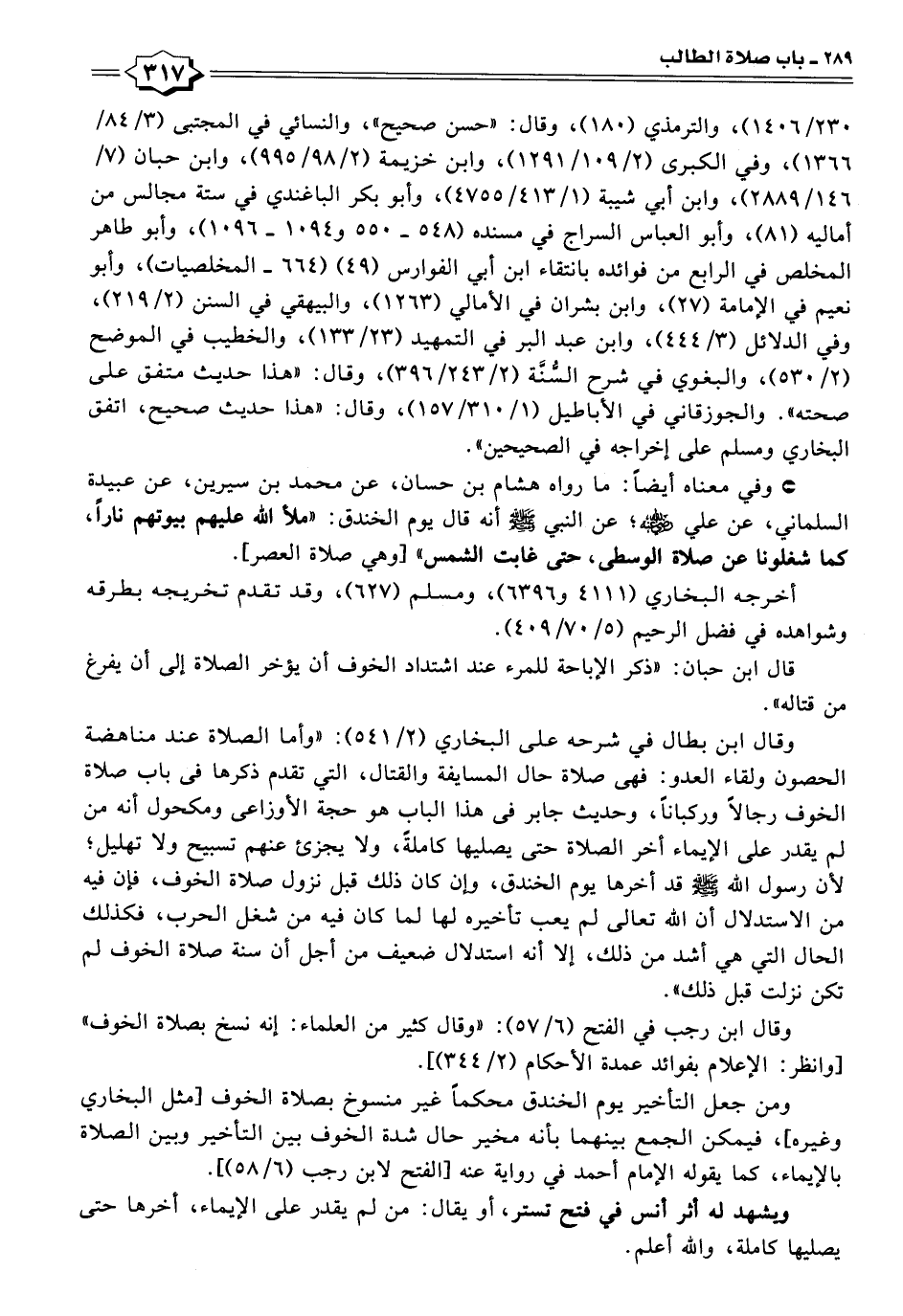 • وفي معناه أيضًا: ما رواه هشام بن حسان، عن محمد بن سيرين، عن عبيدة السلماني، عن علي - رضي الله عنه - عن النبي - صلى الله عليه وسلم - أنه قال يوم الخندق: "ملأ الله عليهم بيوتهم نارًا، كما شغلونا عن صلاة الوسطى، حتى غابت الشمس" [وهي صلاة العصر].