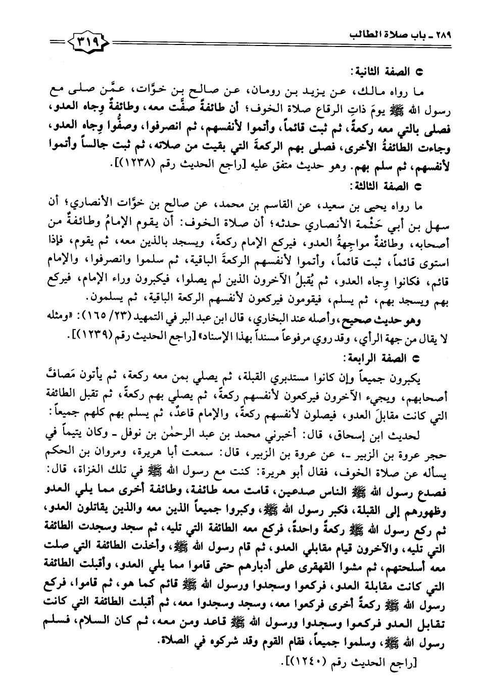 ما رواه مالك، عن يزيد بن رومان، عن صالح بن خوَّات، عمَّن صلى مع رسول الله - صلى الله عليه وسلم - يومَ ذاتِ الرقاع صلاة الخوف؛ أن طائفة صفَّت معه، وطائفةٌ وِجاه العدو، فصلى بالتي معه ركعةً، ثم ثبت قائمًا، وأتموا لأنفسهم، ثم انصرفوا، وصفُّوا وِجاه العدو، وجاءت الطائفةُ الأخرى، فصلى بهم الركعةَ التي بقيت من صلاته، ثم ثبت جالسًا وأتموا لأنفسهم، ثم سلم بهم. وهو حديث متفق عليه [راجع الحديث رقم (١٢٣٨)].