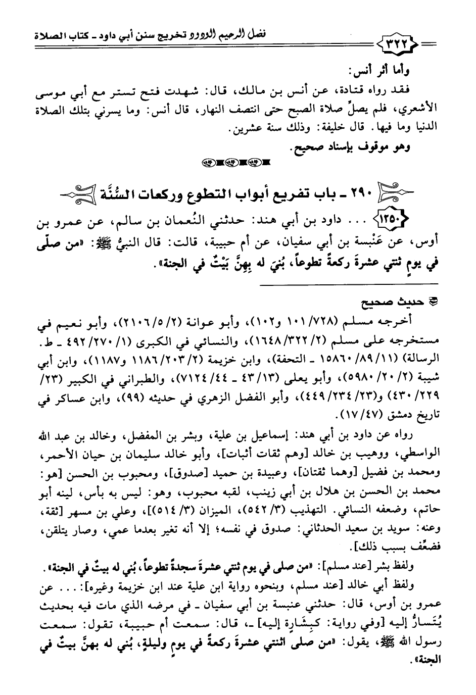 ١٢٥٠ - . . . داود بن أبي هند: حدثني النُعمان بن سالم، عن عمرو بن أوس، عن عَنْبسة بن أبي سفيان، عن أم حبيبة، قالت: قال النبيُّ - صلى الله عليه وسلم -: "من صلّى في يومٍ ثنتي عشرةَ ركعةً تطوعًا، بُنيَ له بِهِنَّ بَيْتٌ في الجنة".