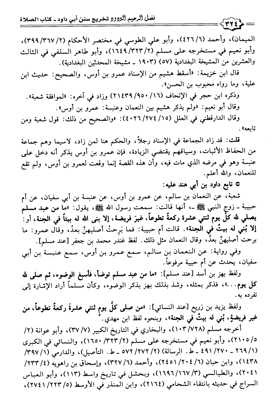 شعبة، عن النعمان بن سالم، عن عمرو بن أوس، عن عنبسة بن أبي سفيان، عن أم حبيبة - زوح النبي - صلى الله عليه وسلم -، أنها قالت: سمعت رسول الله - صلى الله عليه وسلم -، يقول: "ما من عبد مسلم يصلي لله كل يوم ثنتي عشرة ركعةً تطوعًا، غيرَ فريضة، إلا بنى الله له بيتًا في الجنة، أو: إلا بُني له بيتٌ في الجنة". قالت أم حبيبة: فما بَرِحتُ أصليهنَّ بعدُ، وقال عمرو: ما برحت أصليهنَّ بعدُ، وقال النعمان مثل ذلك. لفظ غندر محمد بن جعفر [عند مسلم].