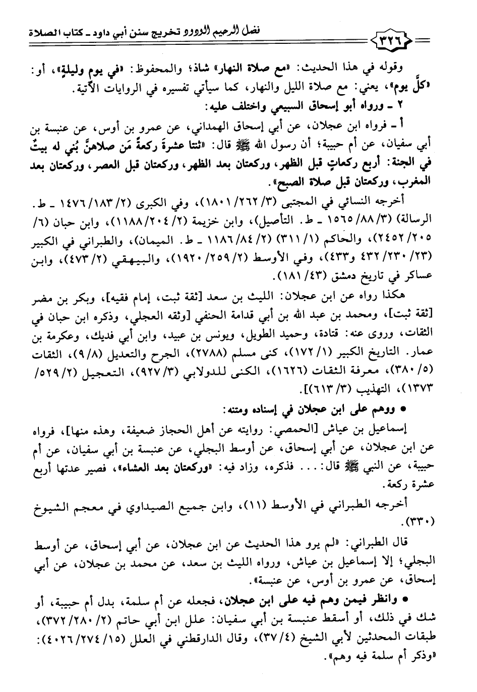 أ - فرواه ابن عجلان، عن أبي إسحاق الهمداني، عن عمرو بن أوس، عن عنبسة بن أبي سفيان، عن أم حبيبة؛ أن رسول الله - صلى الله عليه وسلم - قال: "ثنتا عشرةَ ركعةً مَن صلاهنَّ بُني له بيتٌ في الجنة: أربع ركعاتٍ قبل الظهر، وركعتان بعد الظهر، وركعتان قبل العصر، وركعتان بعد المغرب، وركعتان قبل صلاة الصبح".
