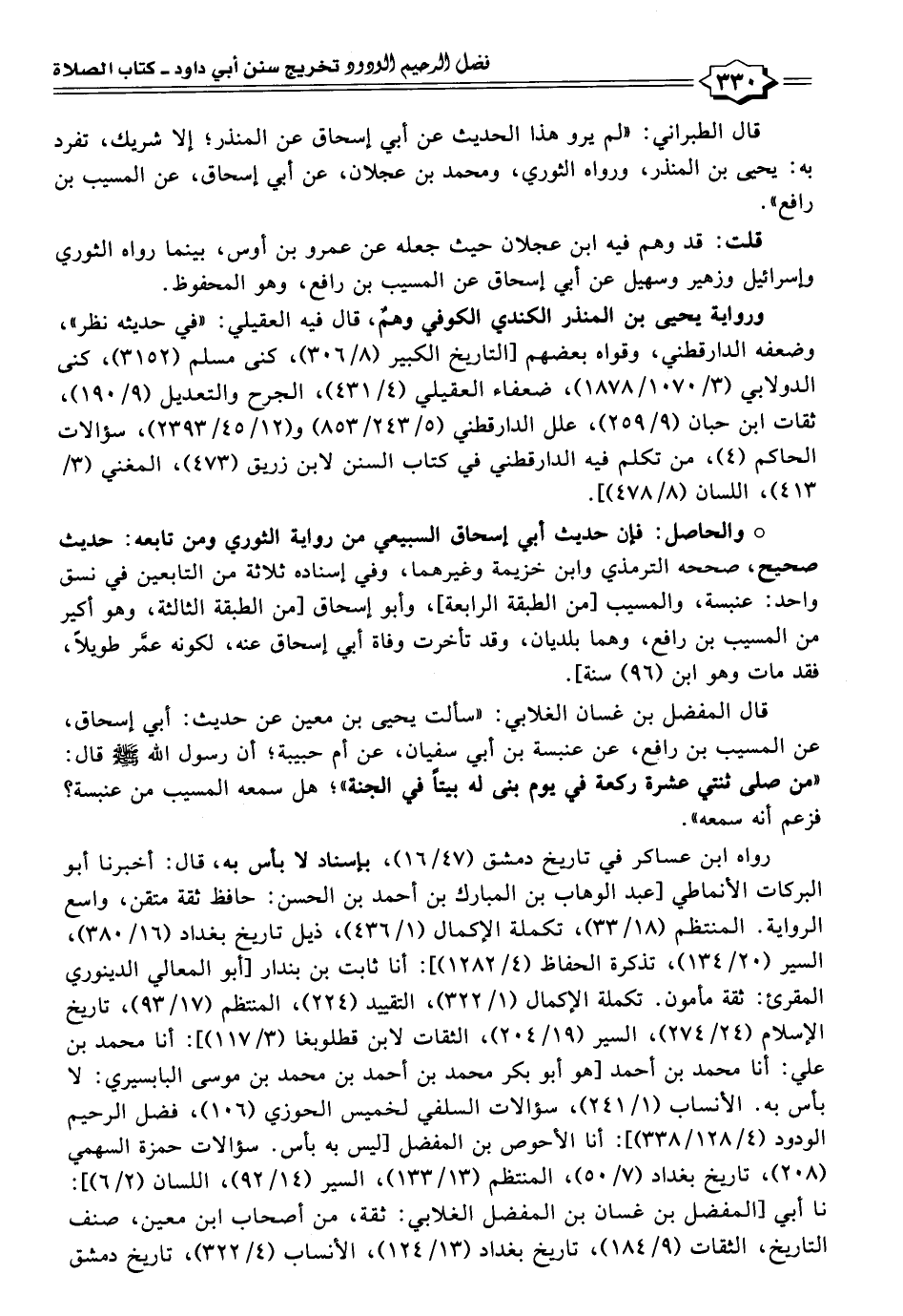 ° والحاصل: فإن حديث أبي إسحاق السبيعي من رواية الثوري ومن تابعه: حديث صحيح، صححه الترمذي وابن خزيمة وغيرهما، وفي إسناده ثلاثة من التابعين في نسق واحد: عنبسة، والمسيب [من الطبقة الرابعة]، وأبو إسحاق [من الطبقة الثالثة، وهو أكبر من المسيب بن رافع، وهما بلديان، وقد تأخرت وفاة أبي إسحاق عنه، لكونه عمَّر طويلًا، فقد مات وهو ابن (٩٦) سنة].