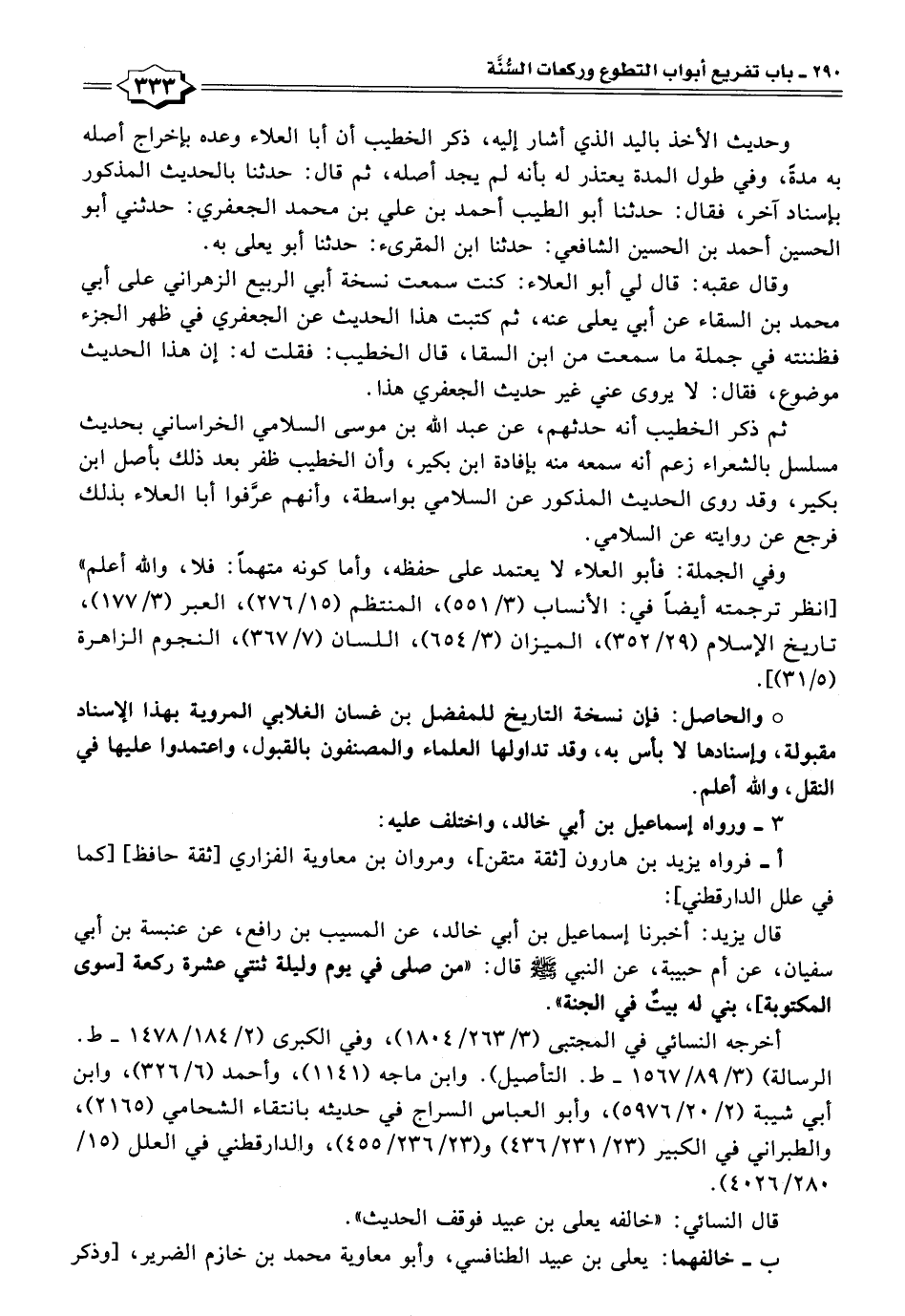 قال يزيد: أخبرنا إسماعيل بن أبي خالد، عن المسيب بن رافع، عن عنبسة بن أبي سفيان، عن أم حبيبة، عن النبي - صلى الله عليه وسلم - قال: "من صلى في يوم وليلة ثنتي عشرة ركعة [سوى المكتوبة]، بني له بيتٌ في الجنة".