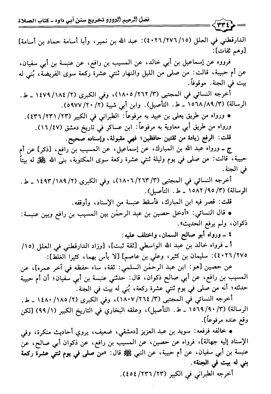 ج - ورواه عبد الله بن المبارك، عن إسماعيل، عن المسيب بن رافع، [ذكر] عن أم حبيبة، قالت: من صلى في يوم وليلة ثنتي عشرة ركعة سوى المكتوبة، بنى الله - عزَّ وجلَّ - له بيتًا في الجنة.