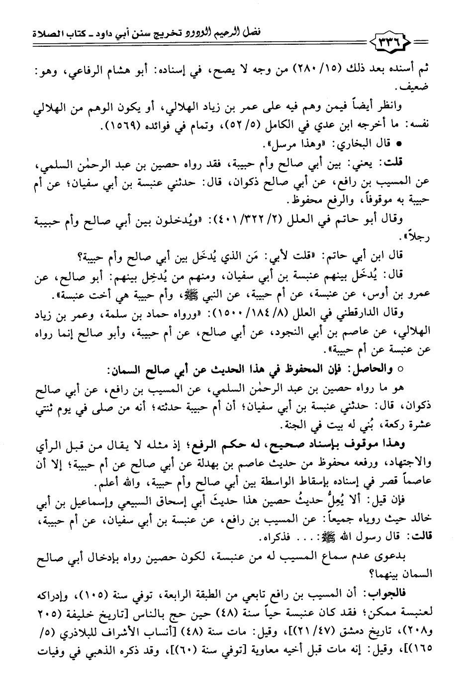 قلت: يعني: بين أبي صالح وأم حبيبة، فقد رواه حصين بن عبد الرحمن السلمي، عن المسيب بن رافع، عن أبي صالح ذكوان، قال: حدثني عنبسة بن أبي سفيان؛ عن أم حبيبة به موقوفًا، والرفع محفوظ.