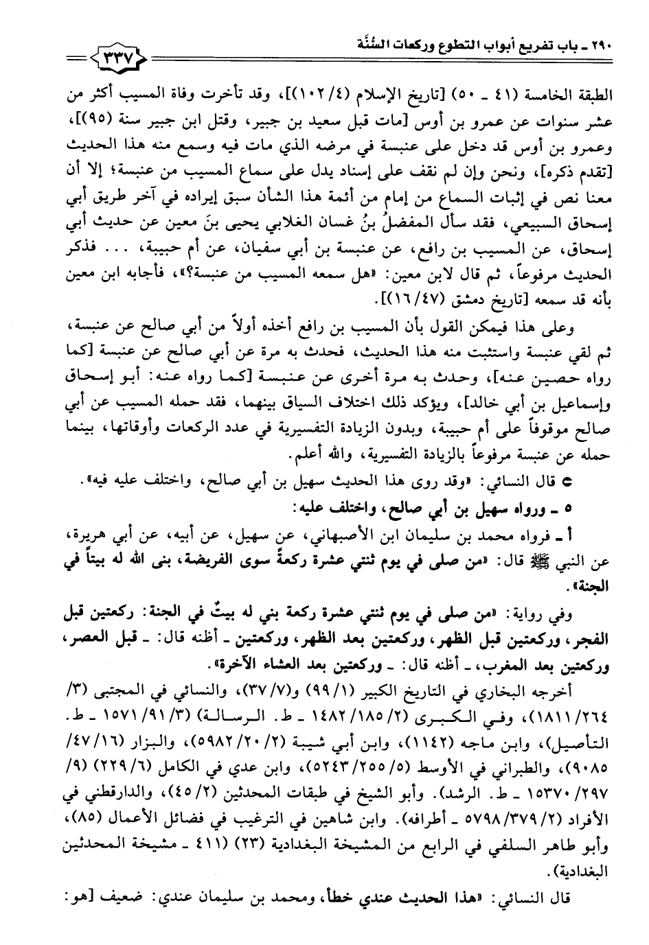 وعلى هذا فيمكن القول بأن المسيب بن رافع أخذه أولًا من أبي صالح عن عنبسة، ثم لقي عنبسة واستثبت منه هذا الحديث، فحدث به مرة عن أبي صالح عن عنبسة [كما رواه حصين عنه]، وحدث به مرة أخرى عن عنبسة [كما رواه عنه: أبو إسحاق وإسماعيل بن أبي خالد]، ويؤكد ذلك اختلاف السياق بينهما، فقد حمله المسيب عن أبي صالح موقوفًا على أم حبيبة، وبدون الزيادة التفسيرية في عدد الركعات وأوقاتها، بينما حمله عن عنبسة مرفوعًا بالزيادة التفسيرية، والله أعلم.
