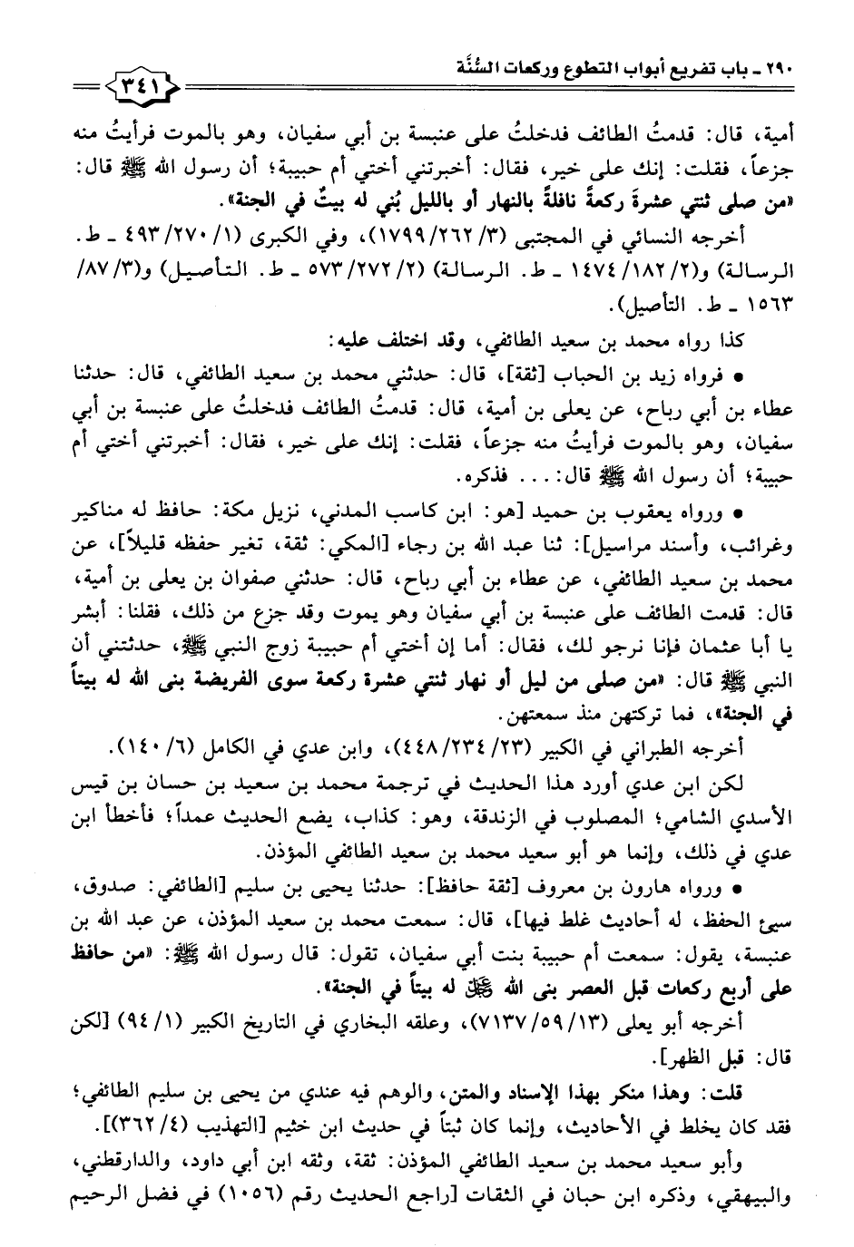 • ورواه هارون بن معروف [ثقة حافظ]: حدثنا يحيى بن سليم [الطائفي: صدوق، سيئ الحفظ، له أحاديث غلط فيها]، قال: سمعت محمد بن سعيد المؤذن، عن عبد الله بن عنبسة، يقول: سمعت أم حبيبة بنت أبي سفيان، تقول: قال رسول الله - صلى الله عليه وسلم -: "من حافظ على أربع ركعات قبل العصر بنى الله - عز وجل - له بيتًا في الجنة".