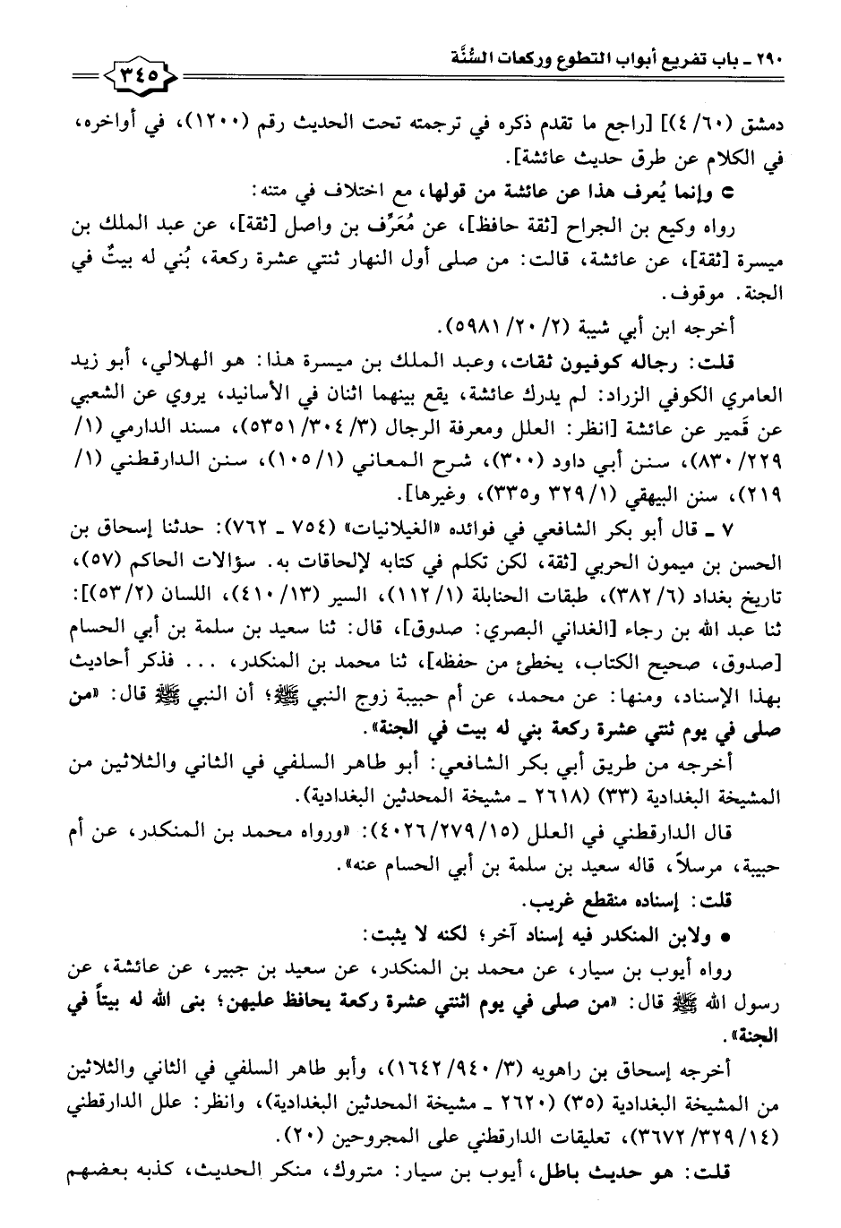 رواه أيوب بن سيار، عن محمد بن المنكدر، عن سعيد بن جبير، عن عائشة، عن رسول الله - صلى الله عليه وسلم - قال: "من صلى في يوم اثنتي عشرة ركعة يحافظ عليهن؛ بنى الله له بيتًا في الجنة".