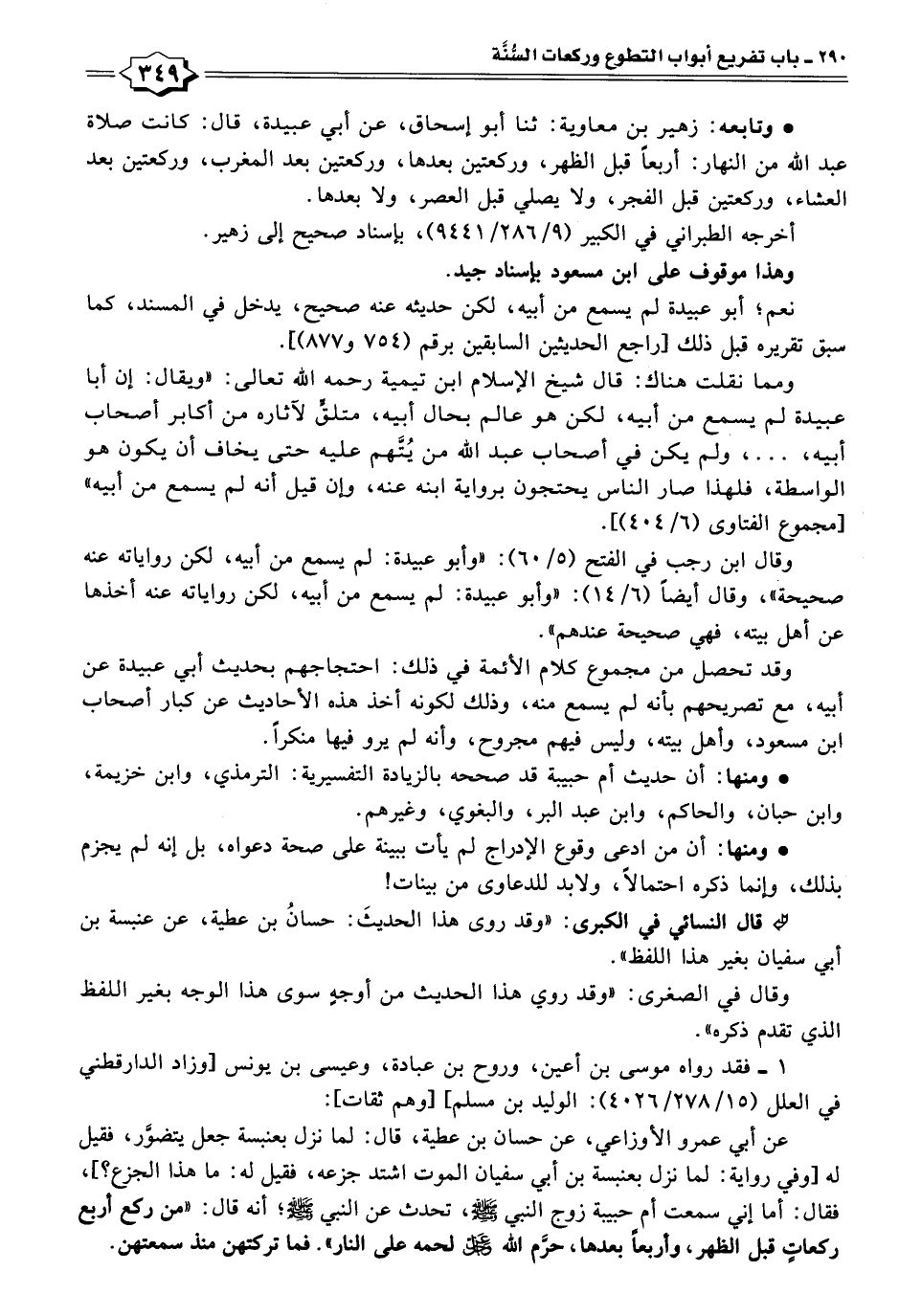 • وتابعه: زهير بن معاوية: ثنا أبو إسحاق، عن أبي عبيدة، قال: كانت صلاة عبد الله من النهار: أربعًا قبل الظهر، وركعتين بعدها، وركعتين بعد المغرب، وركعتين بعد العشاء، وركعتين قبل الفجر، ولا يصلي قبل العصر، ولا بعدها.
