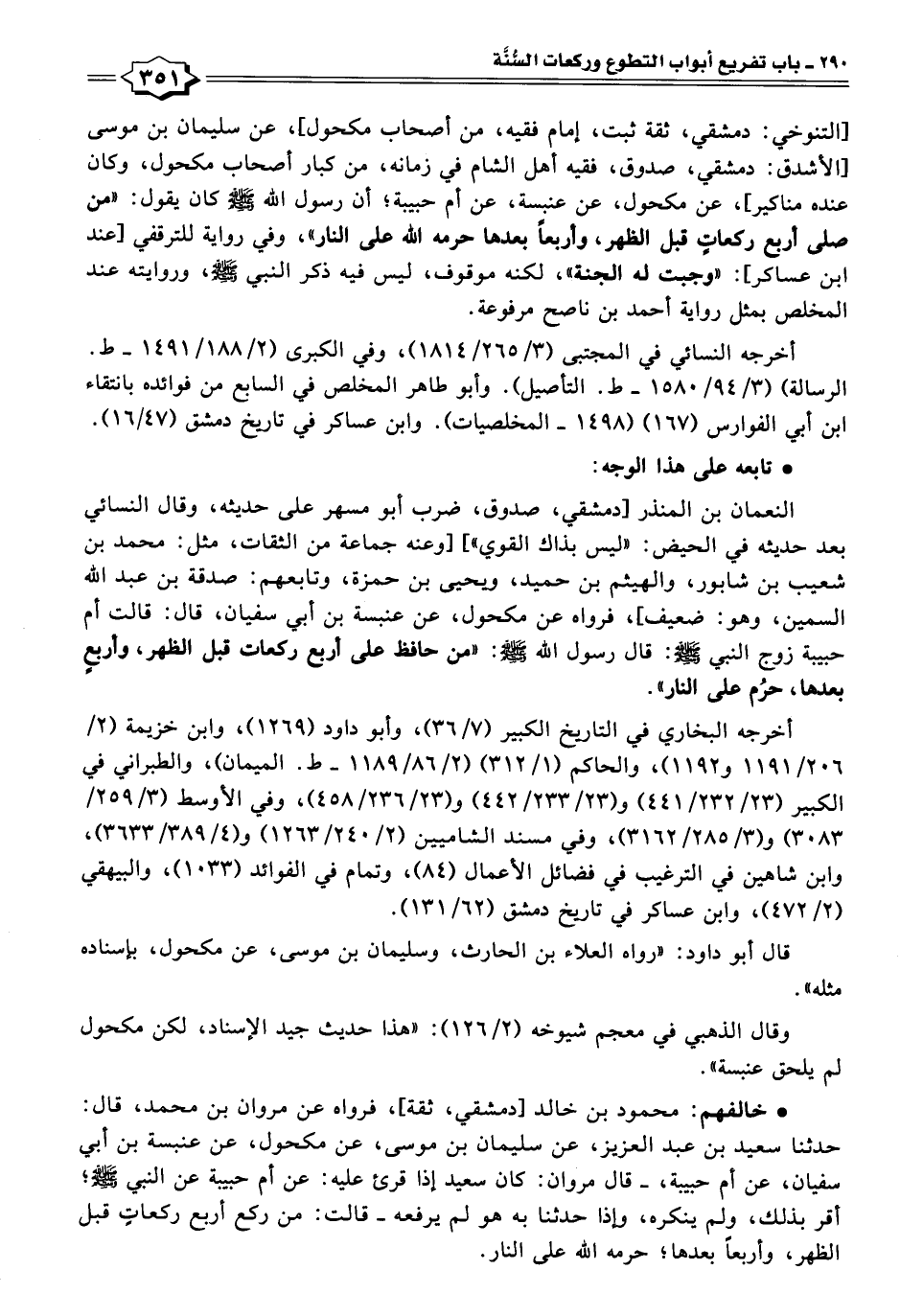 [التنوخي: دمشقي، ثقة ثبت، إمام فقيه، من أصحاب مكحول]، عن سليمان بن موسى [الأشدق: دمشقي، صدوق، فقيه أهل الشام في زمانه، من كبار أصحاب مكحول، وكان عنده مناكير]، عن مكحول، عن عنبسة، عن أم حبيبة؛ أن رسول الله - صلى الله عليه وسلم - كان يقول: "من صلى أربع ركعاتٍ قبل الظهر، وأربعًا بعدها حرمه الله على النار"، وفي رواية للترقفي [عند ابن عساكر]: "وجبت له الجنة"، لكنه موقوف، ليس فيه ذكر النبي - صلى الله عليه وسلم -، وروايته عند المخلص بمثل رواية أحمد بن ناصح مرفوعة.